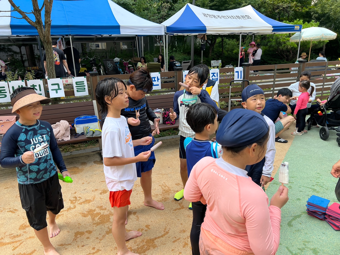 아침 8시부터 아이들이 모이기 시작했습니다. 폭염과 열대야로 이 시간에도 물놀이를 하기 좋습니다. 부모들은 아침 일찍부터 개인 파라솔과 돗자리를 펼쳤습니다. 전날 밤에 좋은 자리를 미리 잡은 분도 계셨습니다. 점점 잔치 분위기가 물씬 납니다.