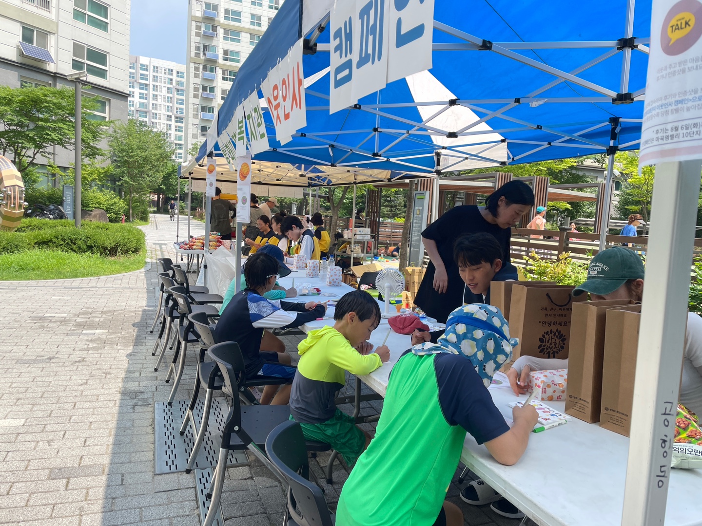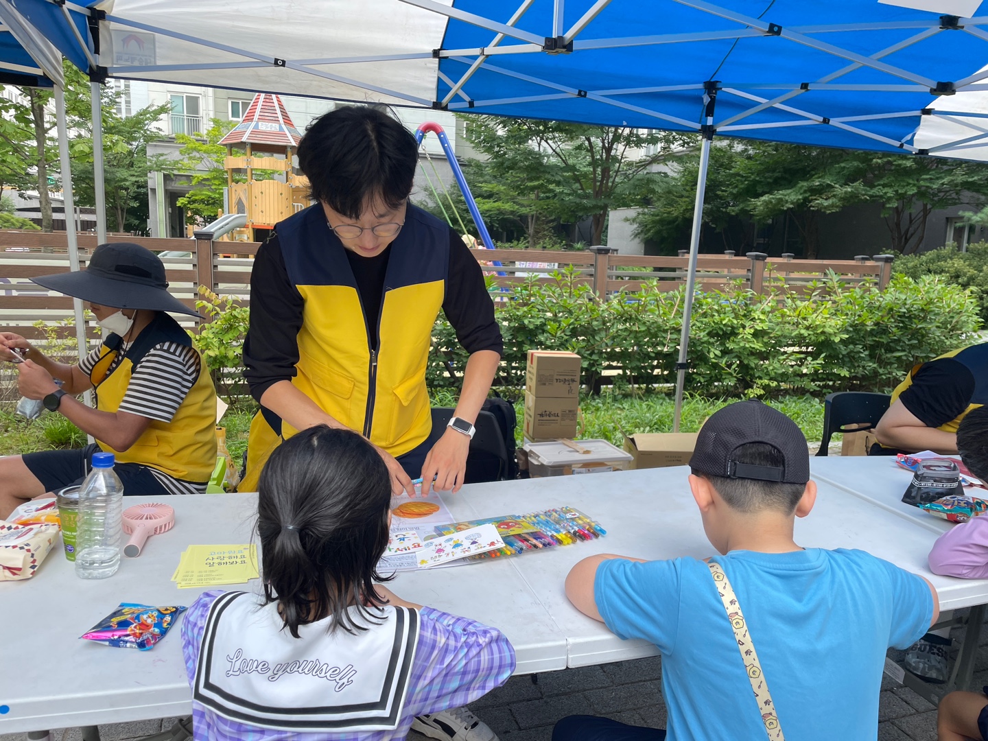 자원봉사자들도 하나둘 도착했습니다. 다함께 천막 책상 의자 물품을 설치했습니다. 10시부터 인사캠페인을 시작했습니다. 꾸준히 입주민들이 참여했습니다. 누구에게 마음을 전할지 궁리하다 이내 편지를 써 내려갔습니다. 물놀이 쉬는 시간에는 많은 사람이 몰려 북새통을 이루었습니다.