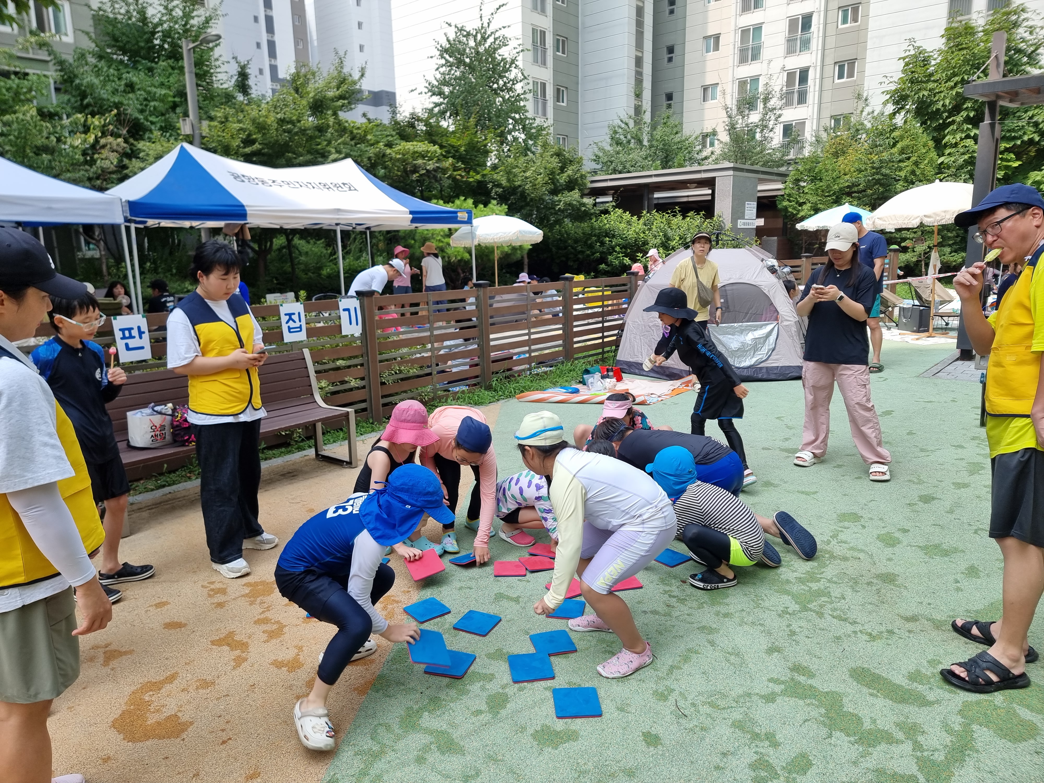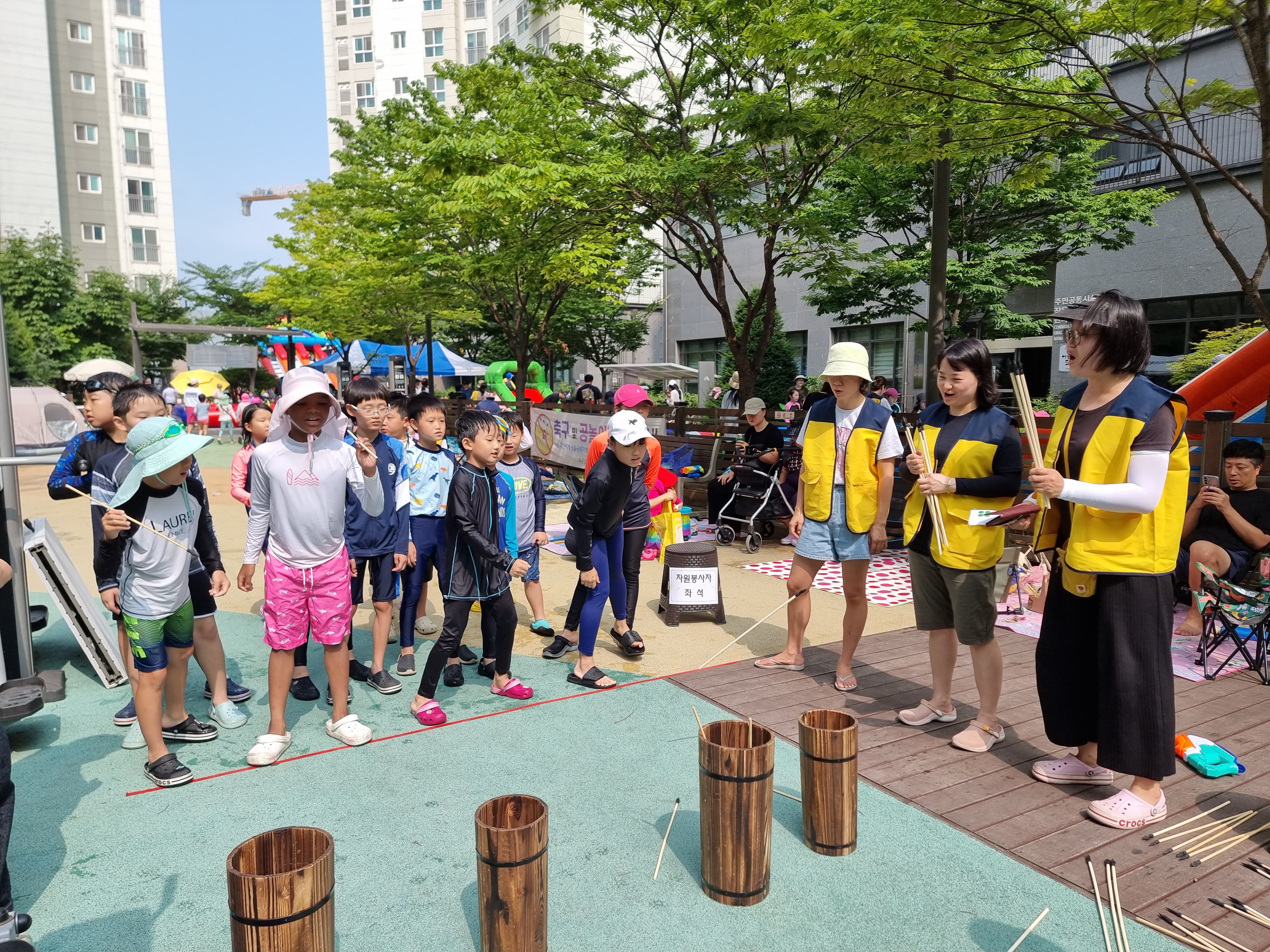 동네친구들 강미애 님과 윤주희 님이 놀이 부스를 맡았습니다. 투호놀이, 콩주머니 던지기, 색판 뒤집기까지 3가지 놀이를 진행합니다. 다른 동네친구들과 입주민들도 시간마다 도와주시기로 했습니다. 물놀이 쉬는 시간마다 놀이마당을 진행하기로 했습니다. 덕분에 행사가 더욱 풍성합니다.