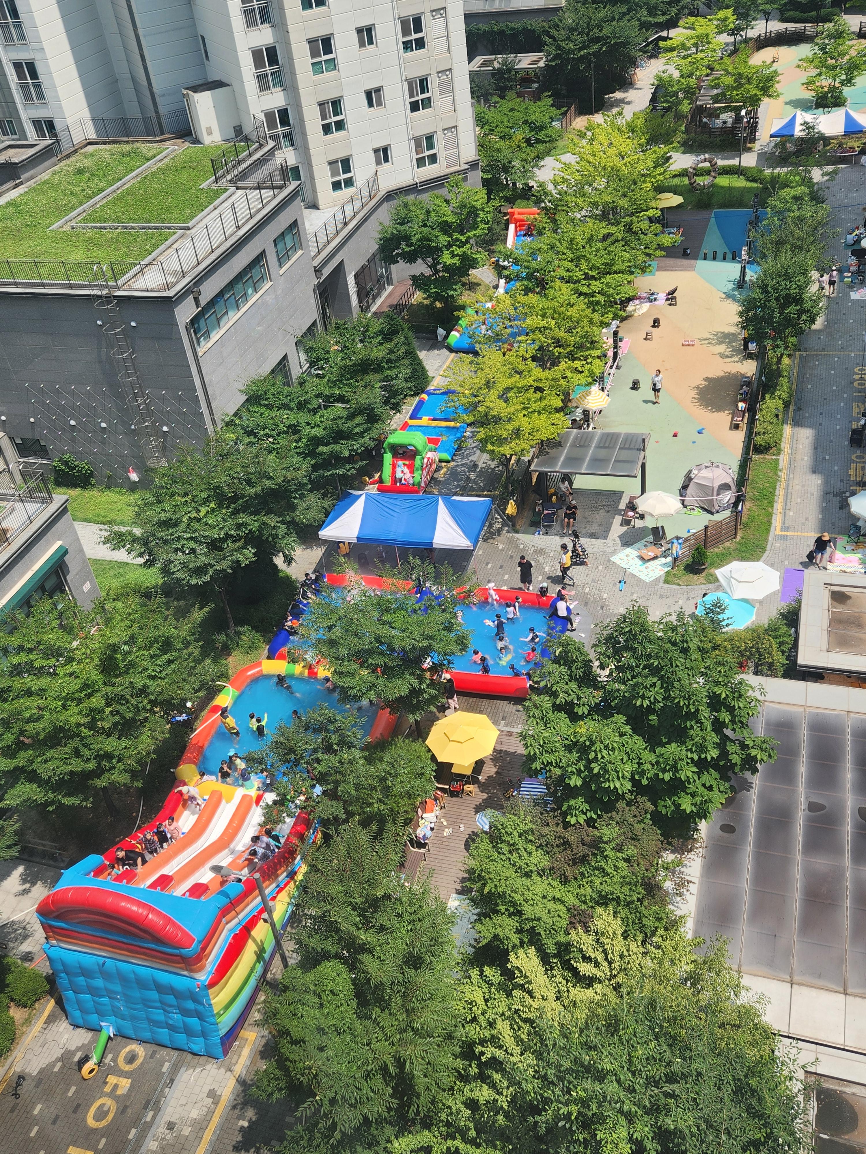 시간이 흐를수록 아이들이 많이 모였습니다. 물 반, 사람 반입니다. 아빠들과 자원봉사자들이 안전하게 놀 수 있도록 계속 살폈습니다. 아파트 그늘 곳곳에는 돗자리와 캠핑 의자로 가득했습니다. 이렇게 아파트 단지 안에서 아이들이 마음껏 뛰어놀 수 있으니 놀랍습니다. 여름 휴양지를 멀리 가지 않아도 집 앞에 근사한 물놀이터가 생긴 겁니다.