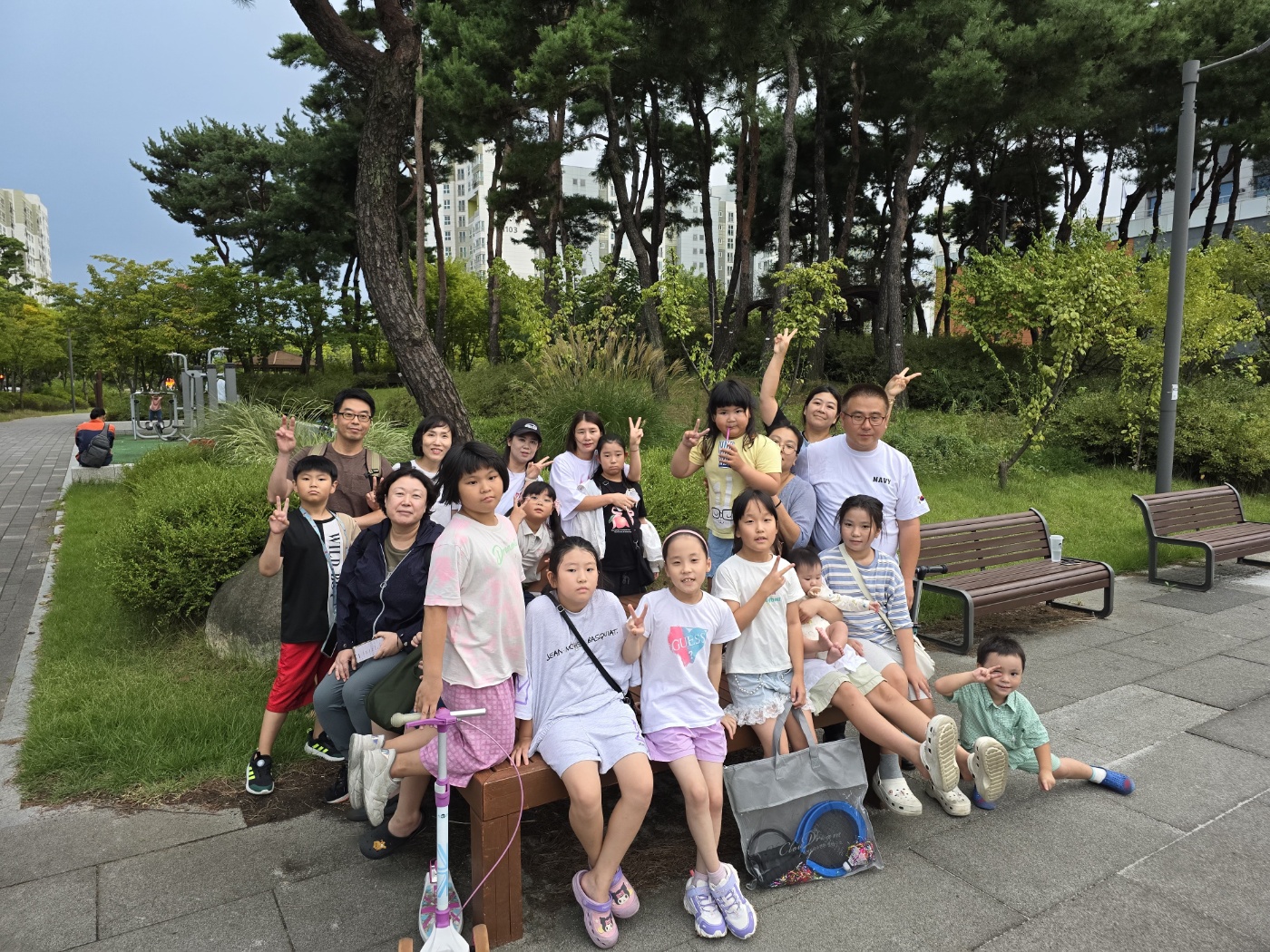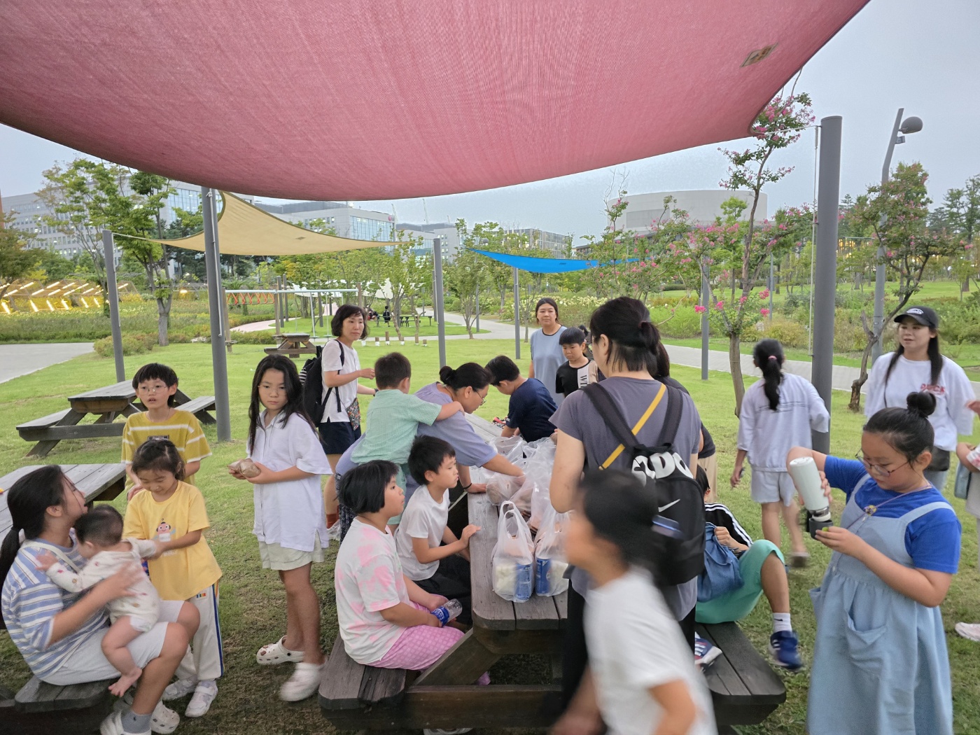 무더운 여름이 지나 더위가 한풀 꺾였지만 해 질 녘 시원한 때에 걷고 놀기로 했습니다. 이번 저녁 식사도 ‘윤쓰 김밥’에서 주문하고, 7월 모임에 인기가 많았던 야채 치킨도 더하기로 했습니다. 물과 음료는 각 가정에서 준비합니다. 10단지에서 다함께 걸어가기로 했습니다. 서울식물원은 마곡하늬공원부터 공원으로만 걸을 수 있는 걷기 좋은 길입니다. 10단지아파트에서부터 서울식물원까지 1.8km입니다. 천천히 3~40분이면 걸어갈 수 있는 거리입니다. 강미애 보육반장님께서 서울식물원 편의점 앞이 벤치, 화장실, 놀이터가 모두 가까이에 있어 함께 놀기 좋다고 알려주셨습니다. 다함께 10단지에 모여서 걸어가되, 자전거를 타는 가정은 편의점 앞에서 만나기로 했습니다.