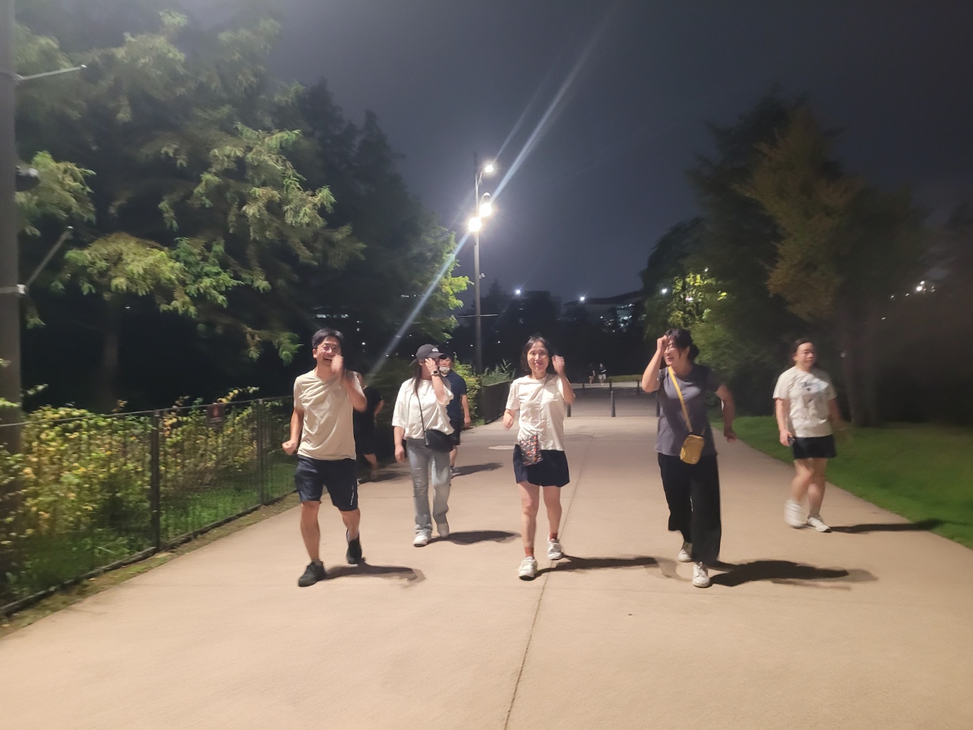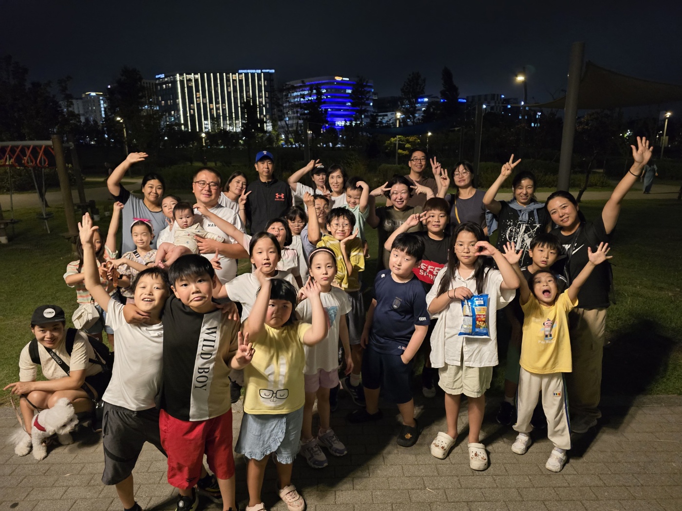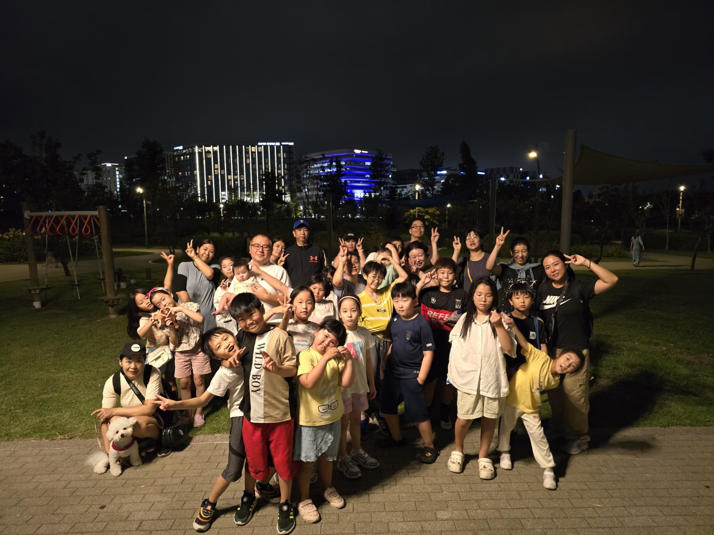 시간이 지나고 다시 돌아갈 시간이 되었습니다. 아이들은 밤늦도록 더 놀고 싶다고 아우성입니다. 다시 30분을 걸어서 돌아가야 하는 만큼 다음을 기약했습니다. 공원에서 해산했습니다. 자전거 탄 사람은 먼저 돌아가고, 걷기팀은 천천히 다시 걸어 돌아왔습니다.
