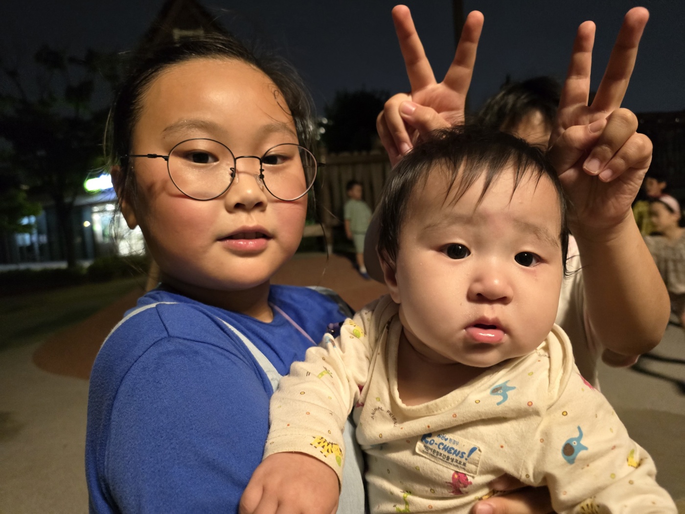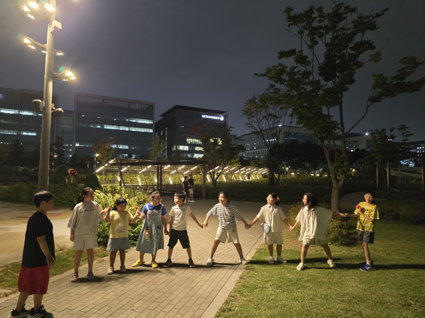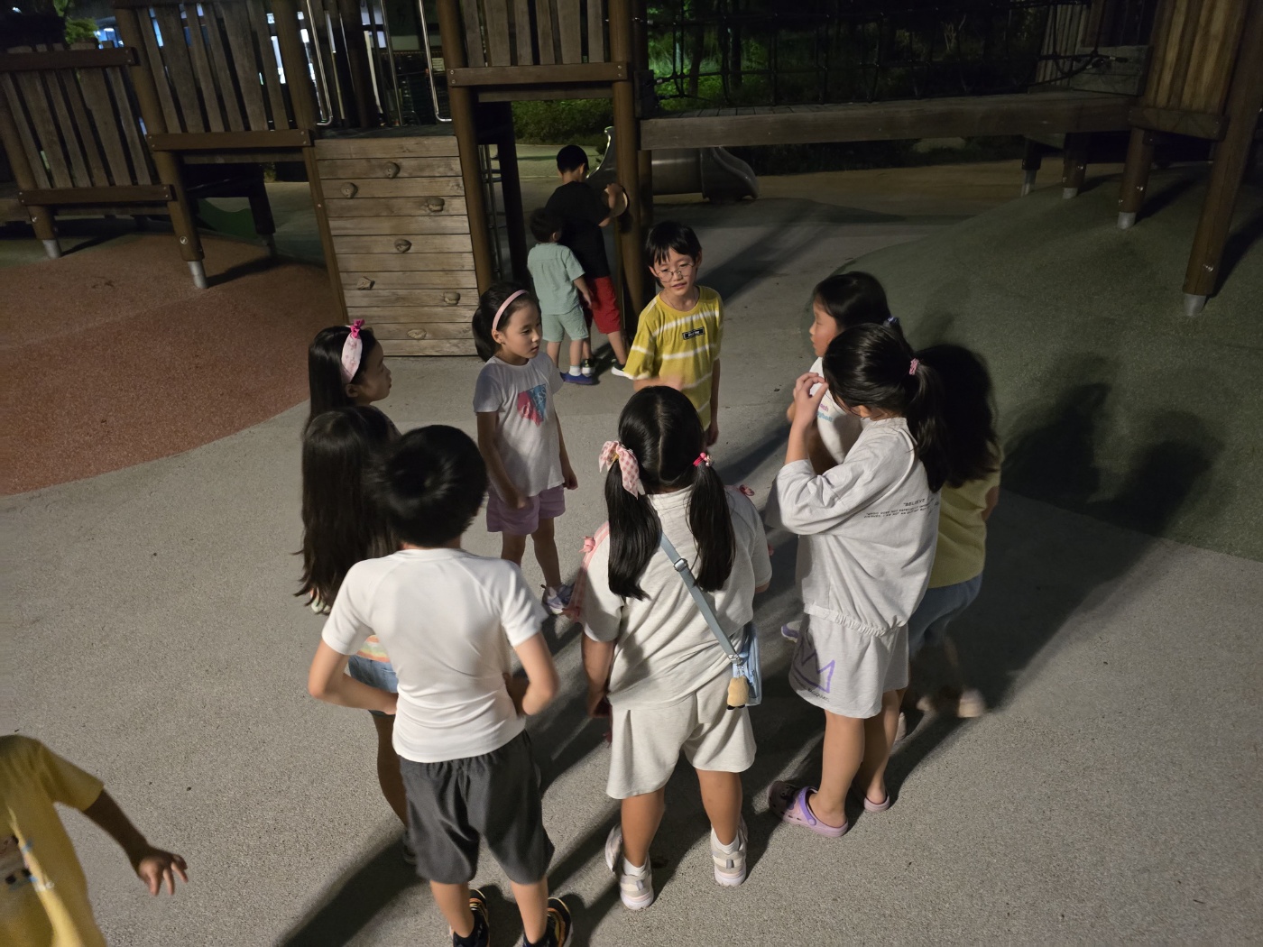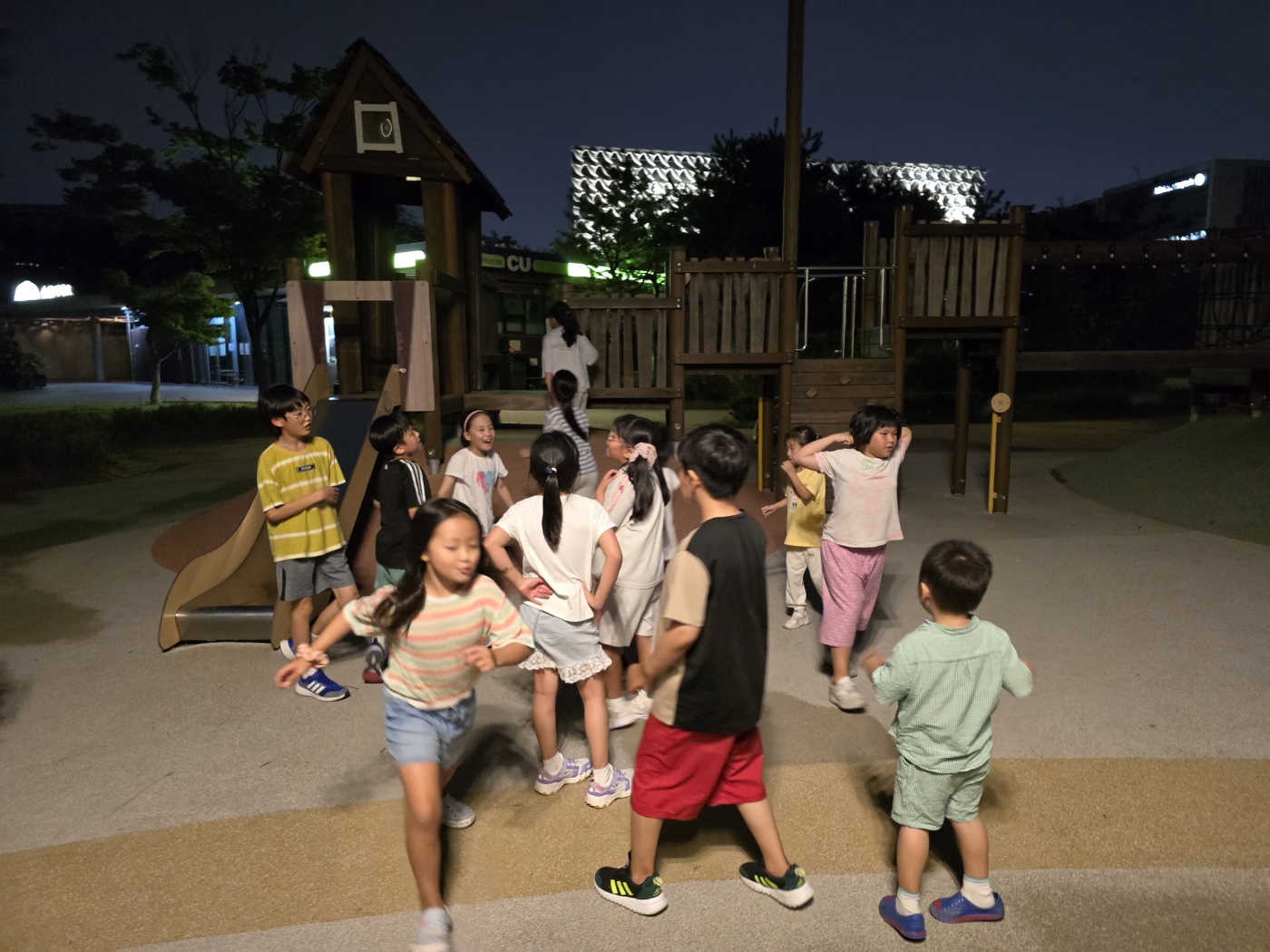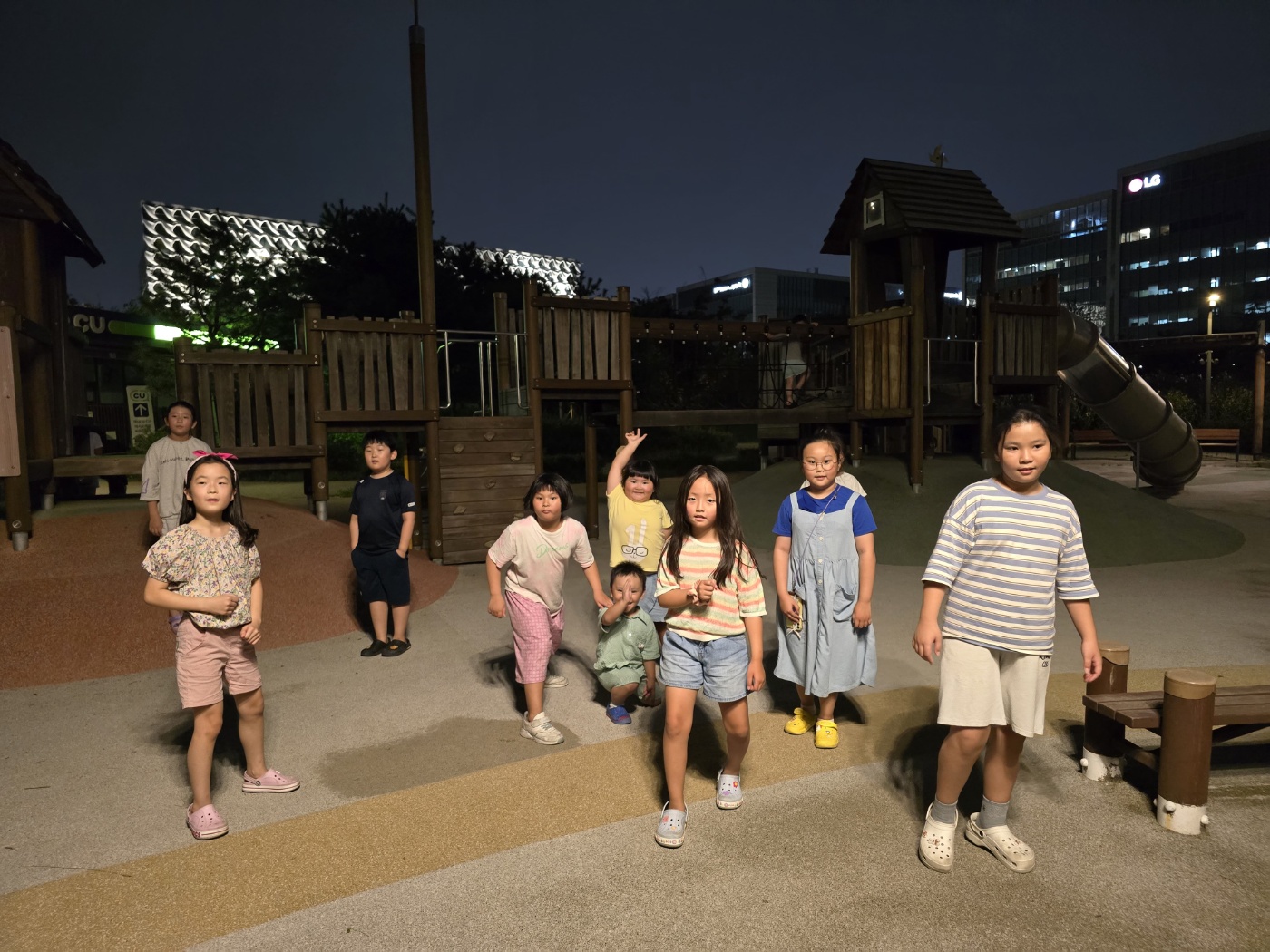 식사가 끝나자마자 아이들은 자연스럽게 놀이터로 모였습니다. 다양한 놀이를 신나게 땀 흘리며 놀았습니다. 걸어오느라 힘들다고 말하던 아이들도 언제 그랬냐는 듯이 놀이터에서 신나게 놀았습니다. 5살 재영이부터 4학년에 이르기까지 동네 형 누나 언니 오빠 친구 동생과 어울렸습니다. 노란색 조명 아래 부모들은 벤치에서 자유롭게 이야기 나누고 아이들은 놀이터에서 뛰어노니 흡사 캠핑장에 온 듯한 모습이었습니다. 아름다웠습니다.