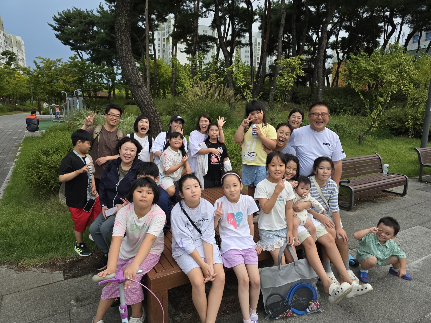 낮에 비 예보가 잠시 있었지만 금방 그쳤습니다. 걷고 놀기 좋은 날씨입니다. 강미애 님 윤주희 님 가족은 자전거를 타고 먼저 출발했습니다. 다른 가족은 다함께 천천히 걷기 시작했습니다. 공원 초입에서 다함께 단체 사진도 찍었습니다. 혼자 걸으면 지루할 길이지만 다함께 걸으니 그 과정도 신납니다.