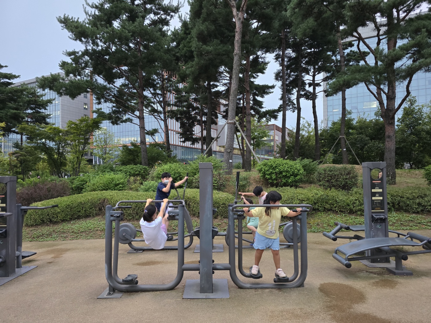 다시 걷기 시작했습니다. 서울식물원에 들어서니 조금씩 날이 어두워졌습니다. 공원 안에 있는 조명이 하나 둘 켜졌습니다. 운동기구가 있는 곳에서 한참 함께 놀기도 했습니다. 이렇게 놀면서 쉬면서 서울식물원에 도착했습니다.