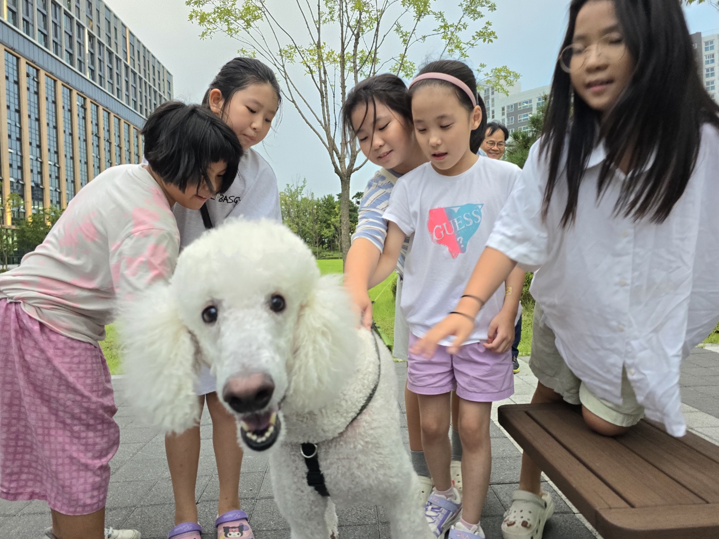 조금 걷다 보니 비가 보슬보슬 내리기 시작했습니다. 일기예보와 달라진 겁니다. 처음에는 모두 당황했지만 이내 즐겁게 다시 걷기 시작했습니다. 때마침 10단지 이웃 한 분이 대형견을 데리고 산책하다가 우리와 만났습니다. 아이들에게 인기만점입니다. 한참을 강아지와 놀다보니 다시 비가 그쳤습니다.