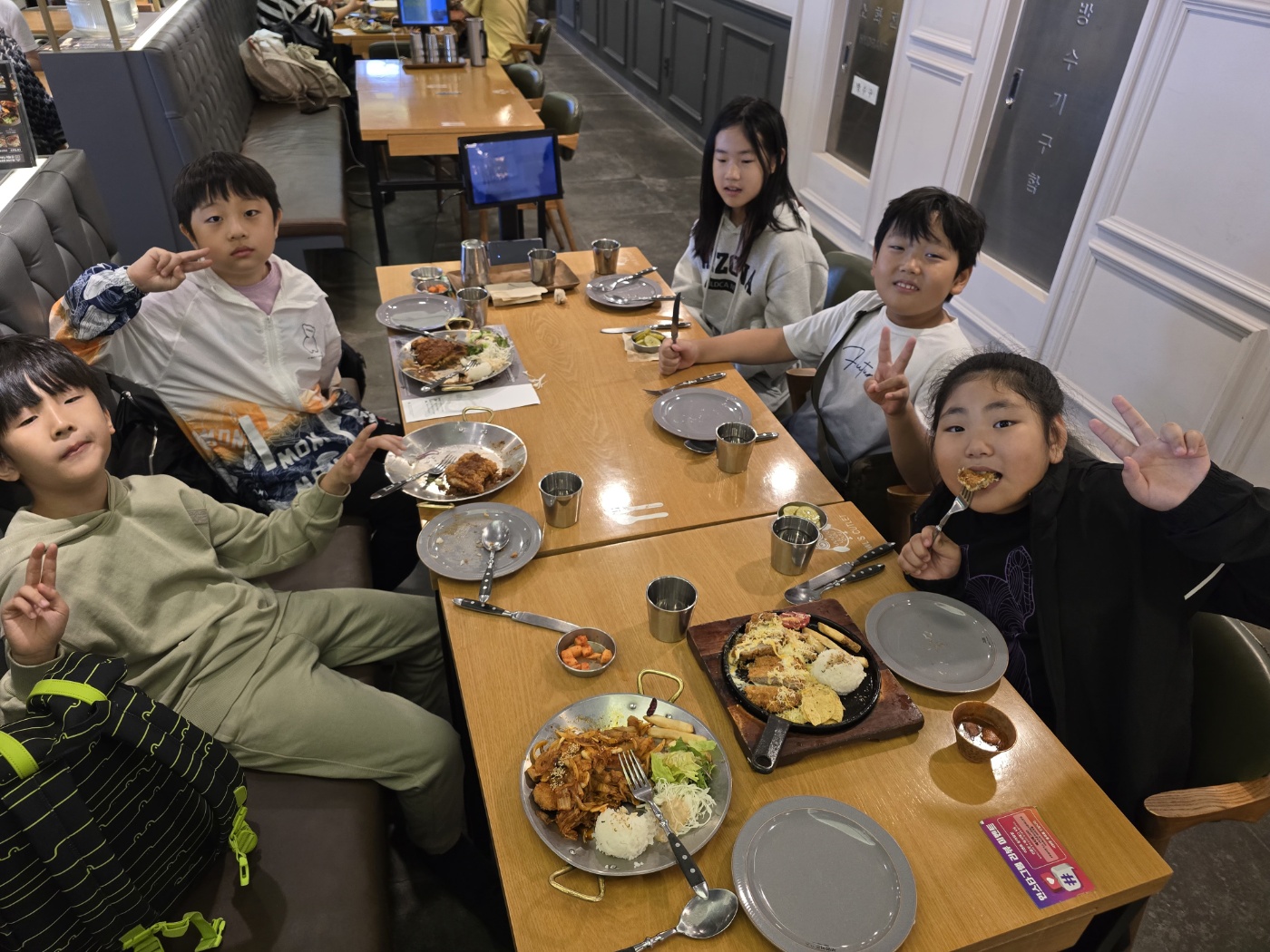 해지기 전에 돈가스를 먹었습니다. 각자 좋아하는 음식을 시켰습니다. 서로 나눠먹으며 맛있게 먹었습니다. 다시 남산공원 곳곳을 구경했습니다. 아이들끼리 우정반지를 맞추기도 했습니다. 집에서 가져온 간식도 서로 나누어 먹었습니다.