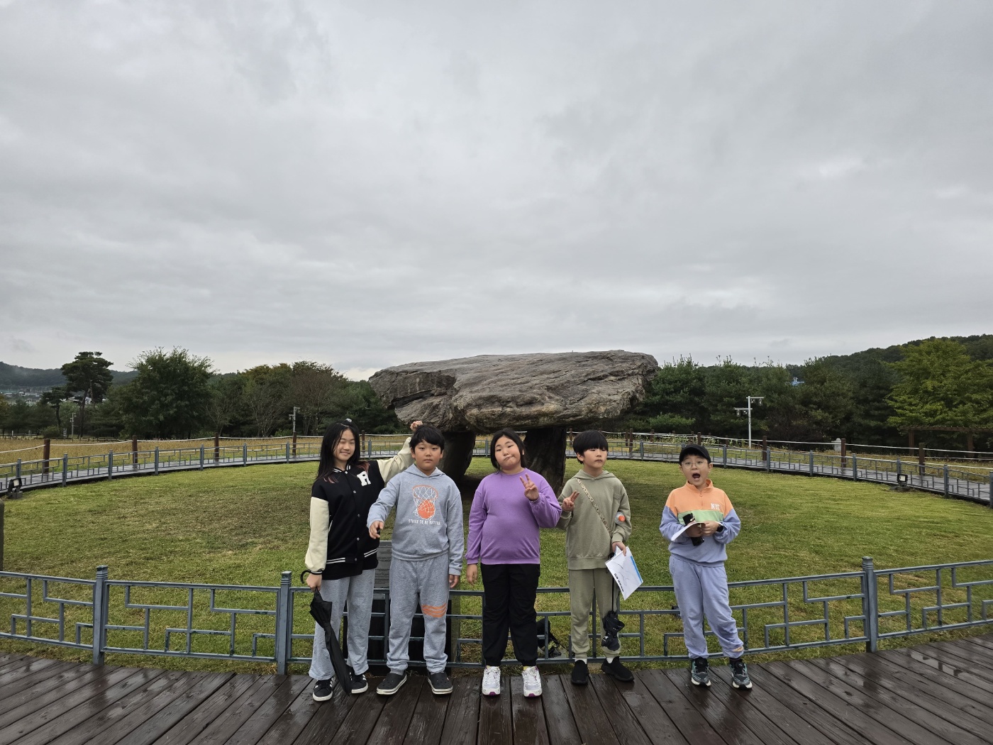 마지막으로 고인돌공원에 갔습니다. 다행히 비가 그쳐서 야외에 있는 고인돌을 보기 편했습니다. 고인돌이 왜 만들어졌는지 질문에 서로 알고 있는 지식을 뽐내며 자랑했습니다.