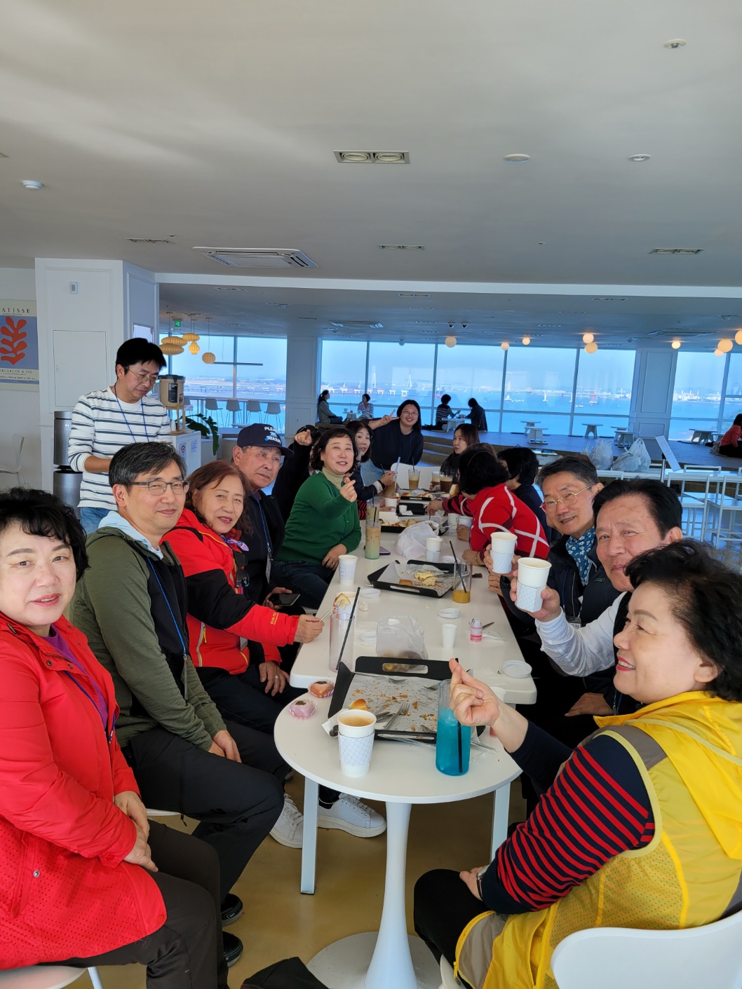 멀지 않은 곳에 카페에 갔습니다. 엘리베이터를 타고 10층에 오르니 통유리로 된 근사한 카페가 나타났습니다. 이렇게 멋진 카페가 있음에 다들 놀라워했습니다. 포토존에서는 누가 먼저라 할 것 없이 서로 사진을 찍어주었습니다. 따뜻한 차와 맛있는 빵까지 넉넉히 먹었습니다.