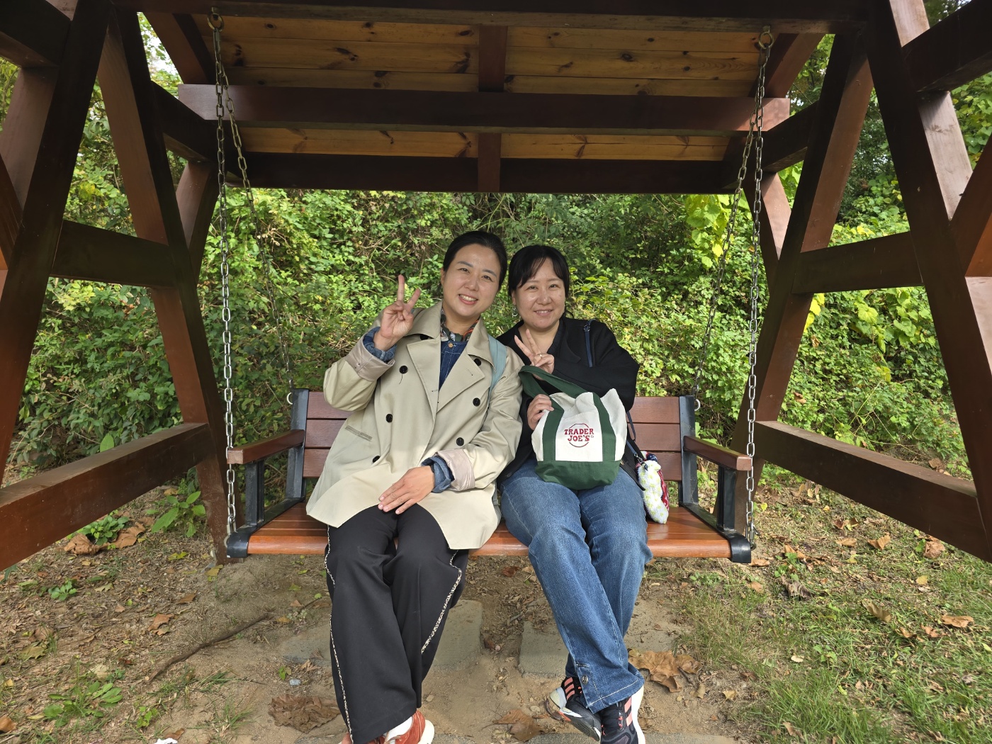 공원 한 곳에 시원한 그늘 밑에 해먹과 벤치가 있었습니다. 윤주희 님과 장홍웨이 님은 동심으로 돌아간 듯 해먹에 누워 서로 손을 잡고 흔들었습니다. 벤치에 누워 하늘을 바라보니 쭉쭉 뻗은 나무와 사이사이 보이는 하늘이 멋졌습니다.