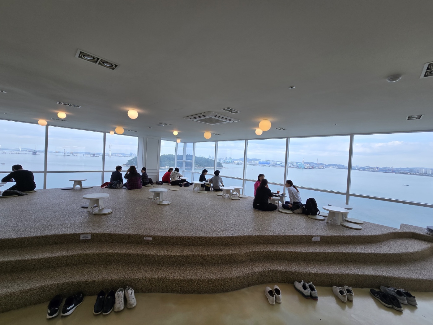 공원을 빠져나와 인근에 있는 카페에 갔습니다. 빌딩 10층에 통유리로 되어 멋진 바다를 조망할 수 있는 곳입니다. 카페에 들어서자마자 감탄했습니다. 저마다 멋진 풍경을 배경으로 근사한 사진을 찍었습니다. 각자 차를 주문했습니다. 김아진 님이 일 년 동안 함께한 이웃들에게 감사한 마음에 빵을 대접했습니다. 윤주희 님은 시골에서 올라온 귤도 내어주셨습니다. 서로가 서로에게 감사했습니다. 예단포 둘레길과 씨사이드파크를 걷고 카페에 옹기종기 둘러앉아 차를 마시니 자연스럽게 수다가 이어졌습니다. 더할 나위 없는 가을 나들이입니다.