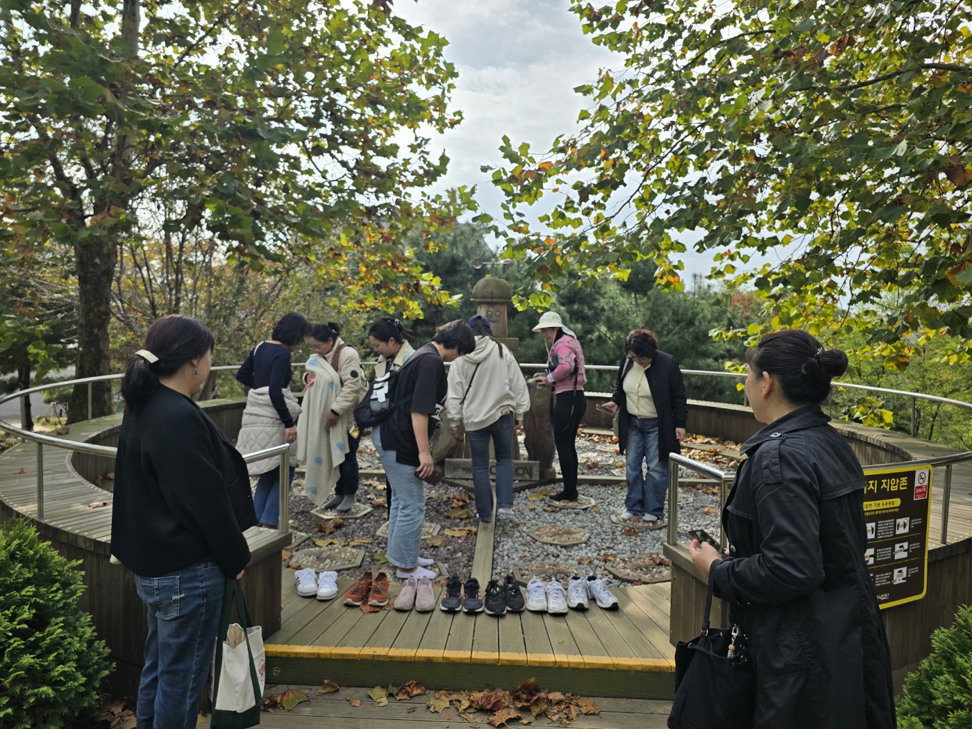 공원 중앙에 돌로 된 발지압 산책로가 있었습니다. 한명 두명 신발을 벗고 올라가더니 어느새 모두 신발을 벗고 함께 발 지압을 했습니다. 시원한 지압에 고통인 듯 환호인 듯 소리를 내질렀습니다. 누군가의 제안으로 모두 발을 한 곳에 동그랗게 모아 사진도 찍었습니다. 젊은 청년들의 감성 같다며 즐거워했습니다. 곳곳에 빨갛게 익어가는 단풍도 아름다웠습니다.