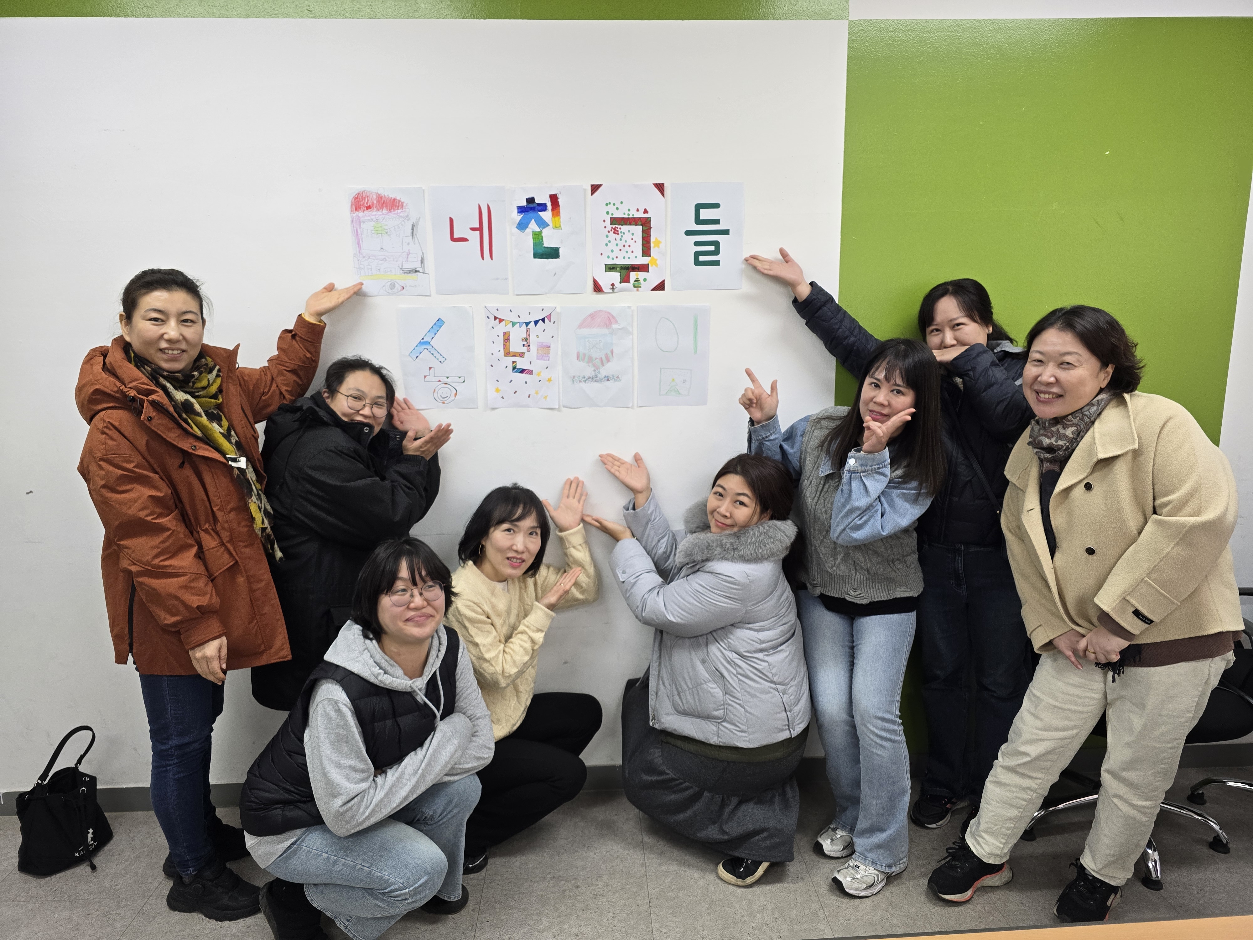 송년 모임 당일입니다. 아침부터 엄마들이 서로 만나서 함께 오는 약속을 주고받았습니다. 정겹게 복지관 공유터에 모였습니다.
