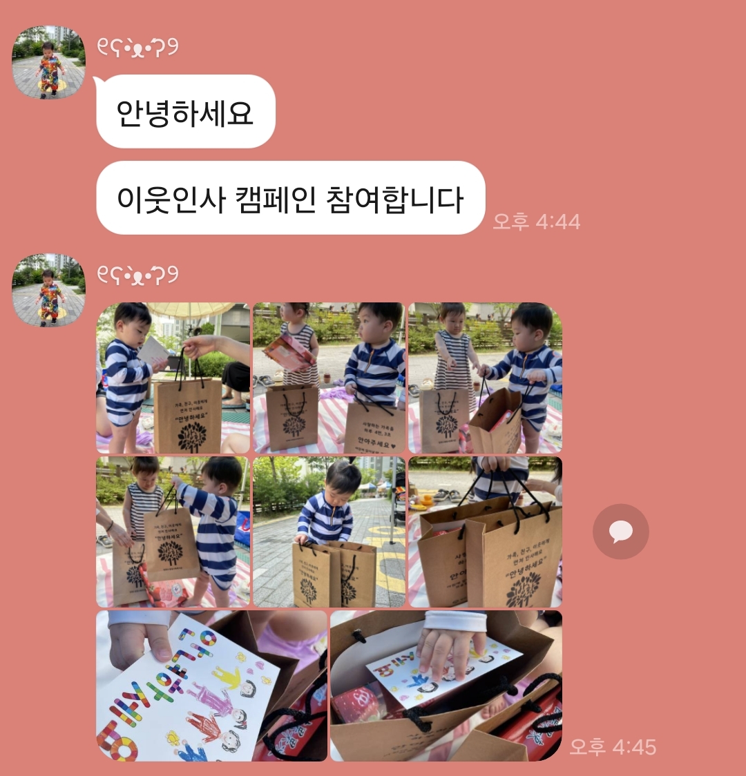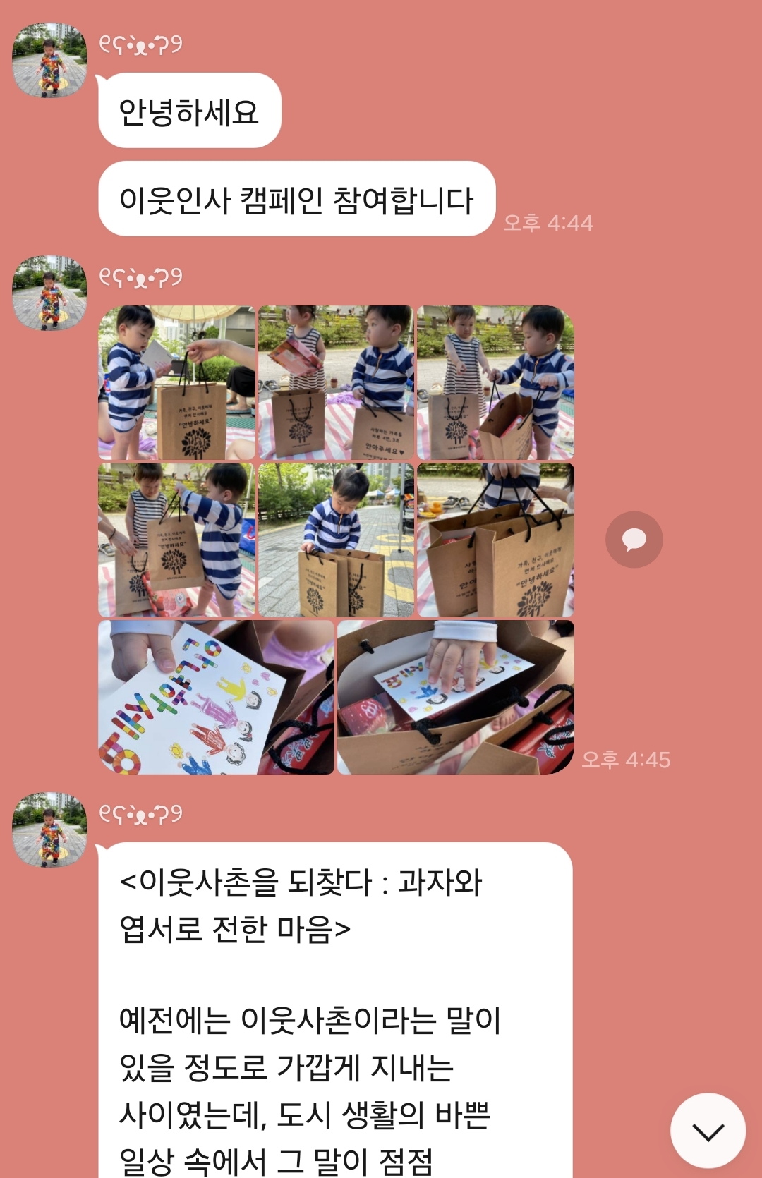 평소 엘리베이터나 복도에서 인사를 주고받던 사이였지만 이렇게 직접적인 소통을 하니 더욱 가까워진 느낌이 들었습니다. 이번 행사를 통해 저는 작은 정성과 마음만으로도 이웃과의 관계를 더욱 돈독하게 만들 수 있다는 것을 깨달았습니다. 앞으로도 이런 소소한 이벤트를 통해 우리 동네가 더욱 따뜻하고 정이 넘치는 곳이 되기를 바랍니다. 이렇게 서로에게 조금 더 다가가는 노력만으로도 마음이 따뜻해지는 것을 느낀 소중한 경험이었습니다.