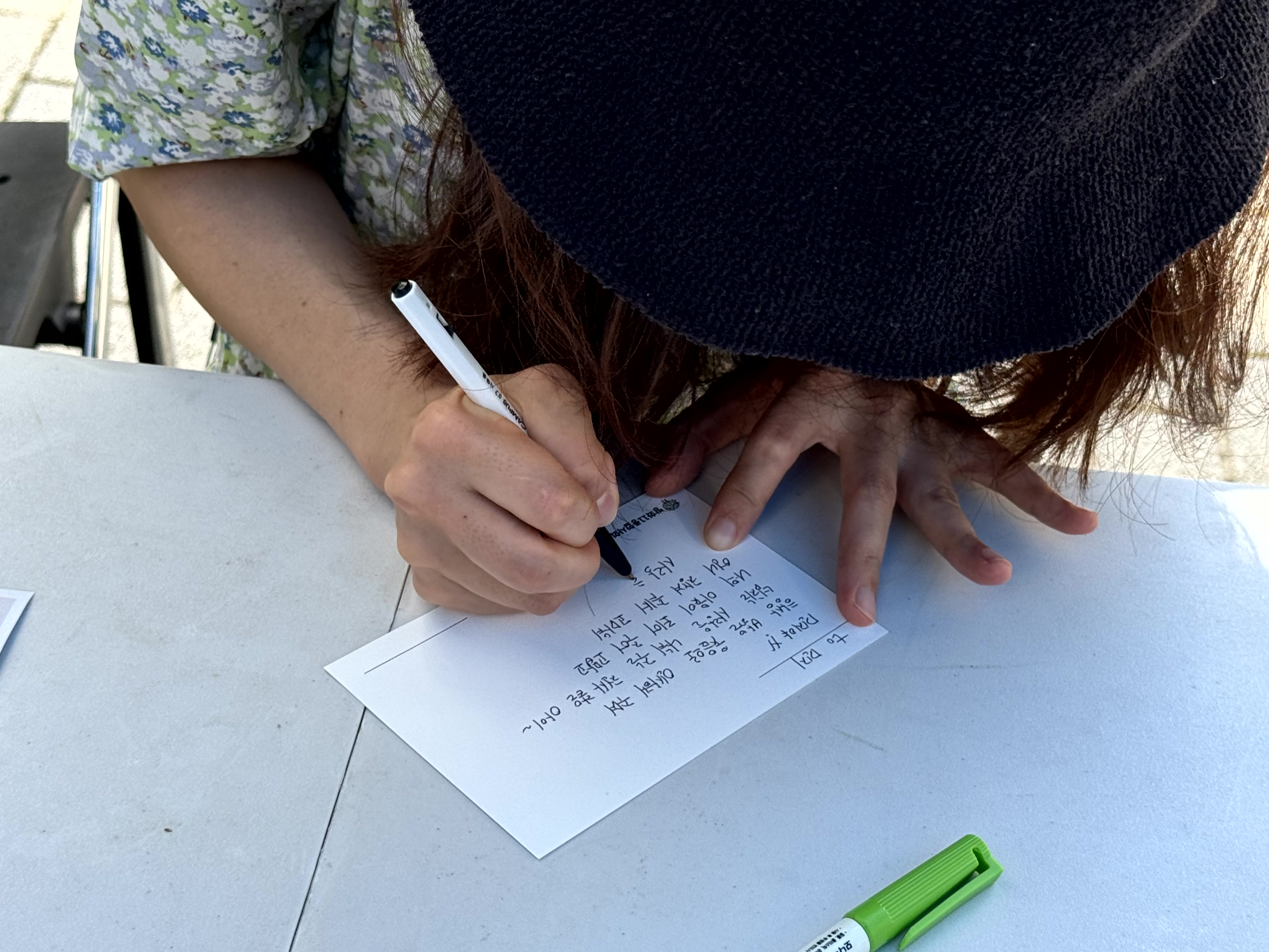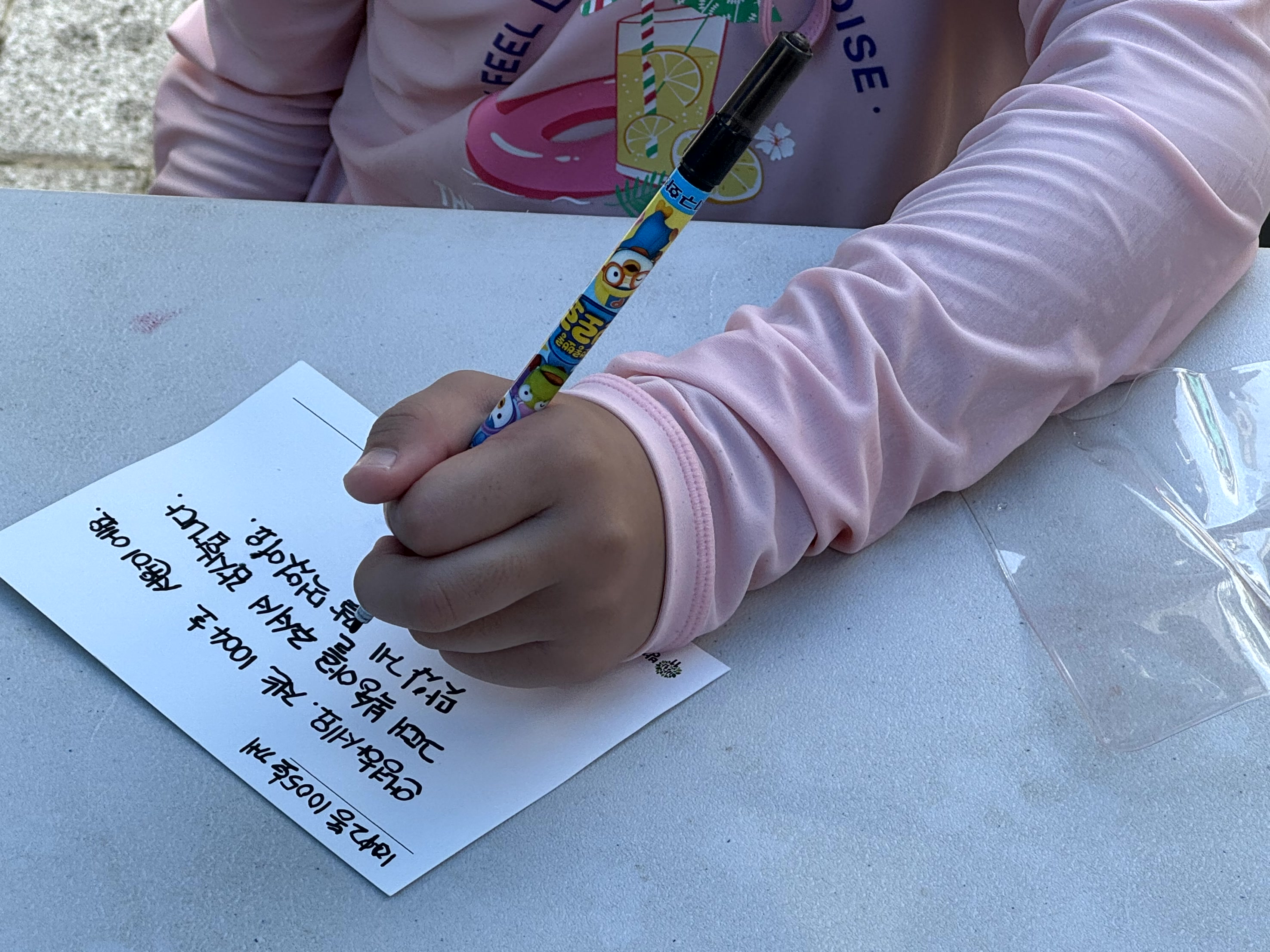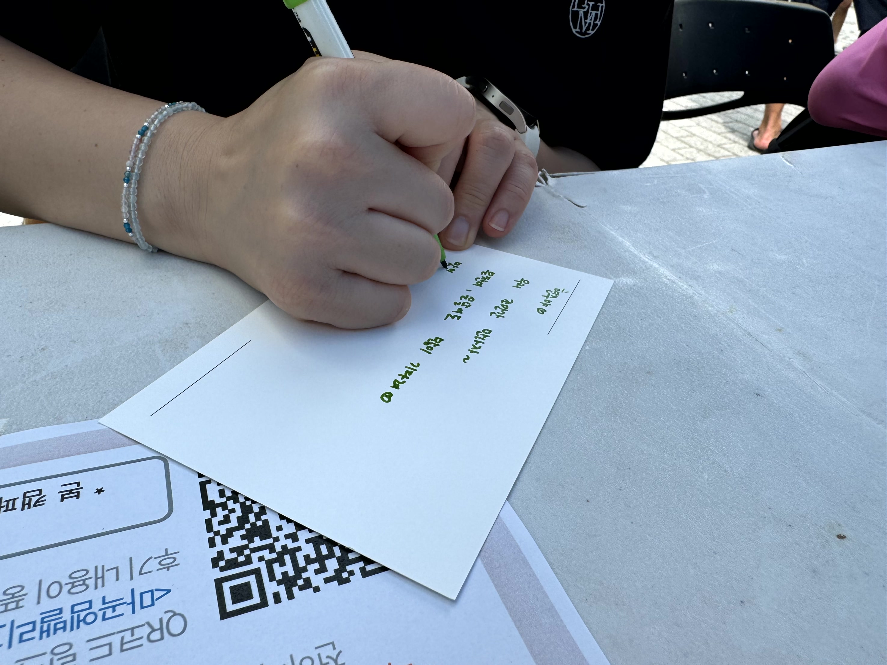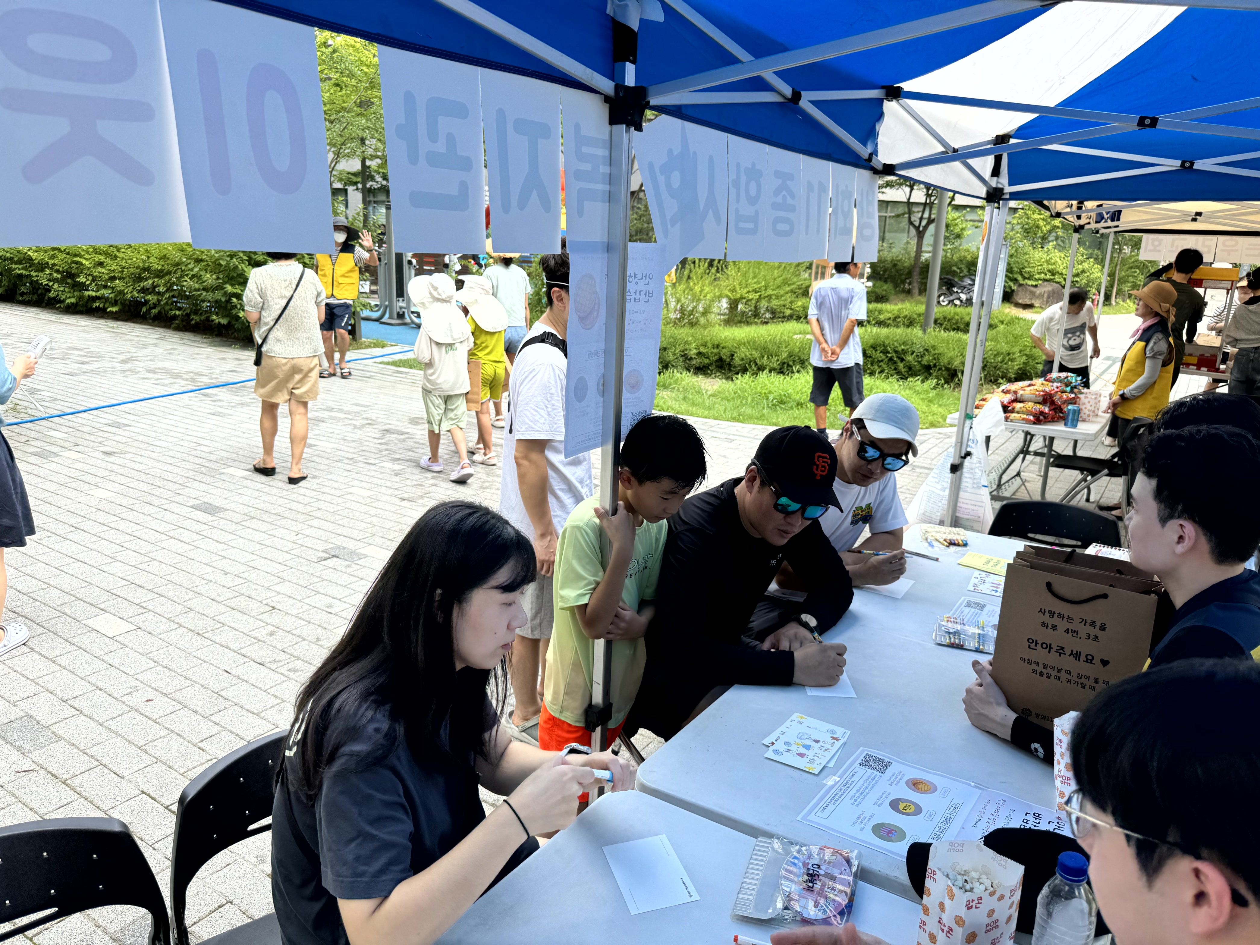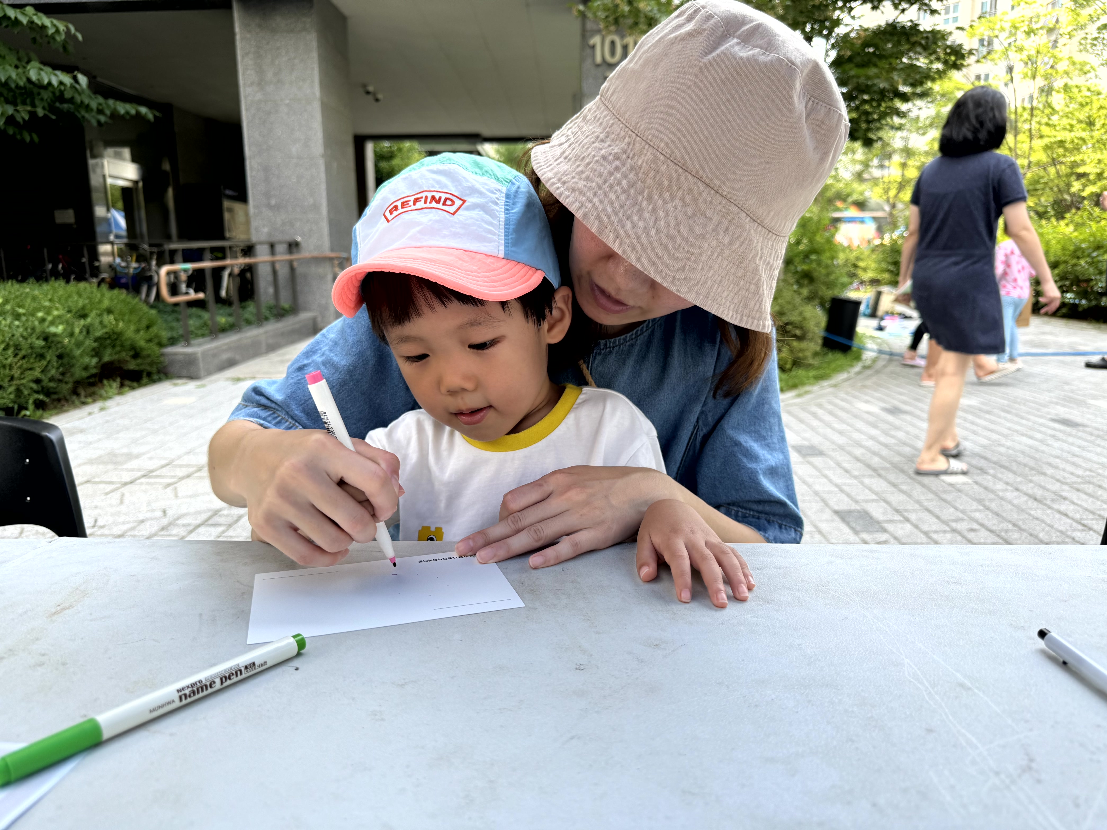 물놀이 잔치 당일이 되었습니다. 아파트 한 곳에서 자리를 잡았습니다. 물놀이 50분에 쉬는 시간 10분입니다. 쉬는 시간에 특히 사람들이 많이 몰렸습니다. 쉬는 시간이 지나도 정성껏 엽서에 편지를 쓰며 어떻게 전할지 궁리했습니다. 대만 과자 하나는 우리 가족이 먹고, 다른 하나는 이웃에게 엽서와 함께 전하는 겁니다. 어린아이부터 부모들까지 함께 참여했습니다. 아이들은 고사리 같은 손으로 정성껏 편지를 썼습니다. 부모들은 이웃인사 캠페인 취지를 잘 이해해주셨습니다.