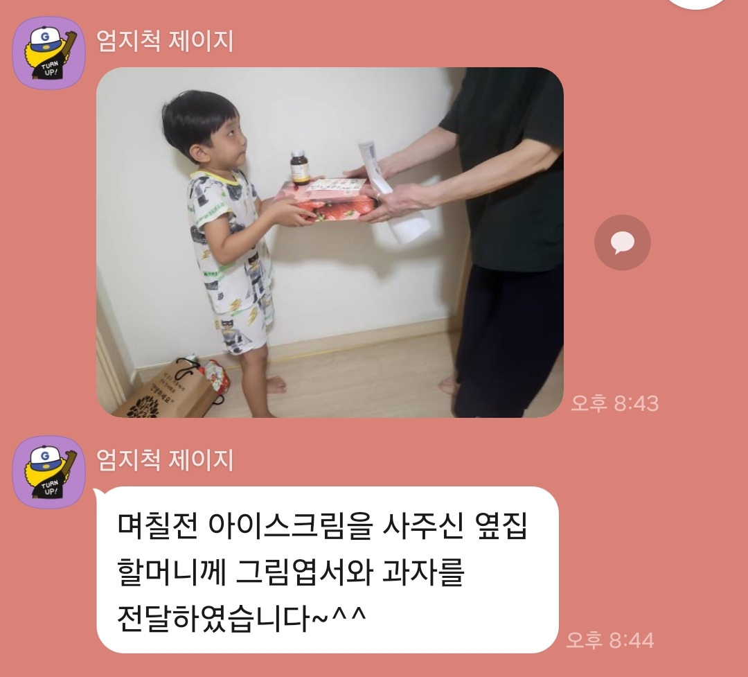 며칠 전 아이스크림을 사주신 옆집 할머니께 그림엽서와 과자를 전달하였습니다.