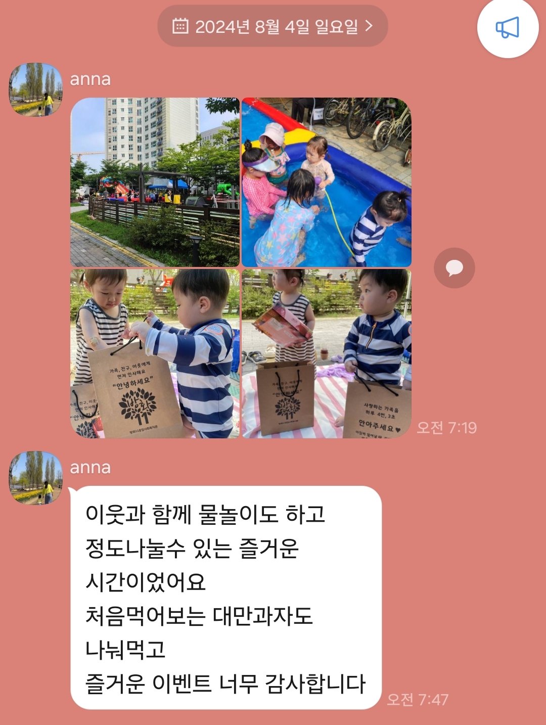 이웃과 함께 물놀이도 하고 정도 나눌 수 있는 즐거운 시간이었어요. 처음먹어보는 대만과자도 나눠먹고 즐거운 이벤트 너무 감사합니다. (anna)