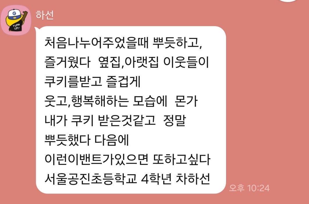 처음 나누어주었을 때 “뿌듯하고 즐거웠다. 옆집 아랫집 이웃들이 쿠키를 받고 즐겁게 웃고 행복해하는 모습에 뭔가 내가 쿠키 받은 것 같고 정말 뿌듯했다. 다음에 이런 이벤트가 있으면 또하고 싶다. (하선)