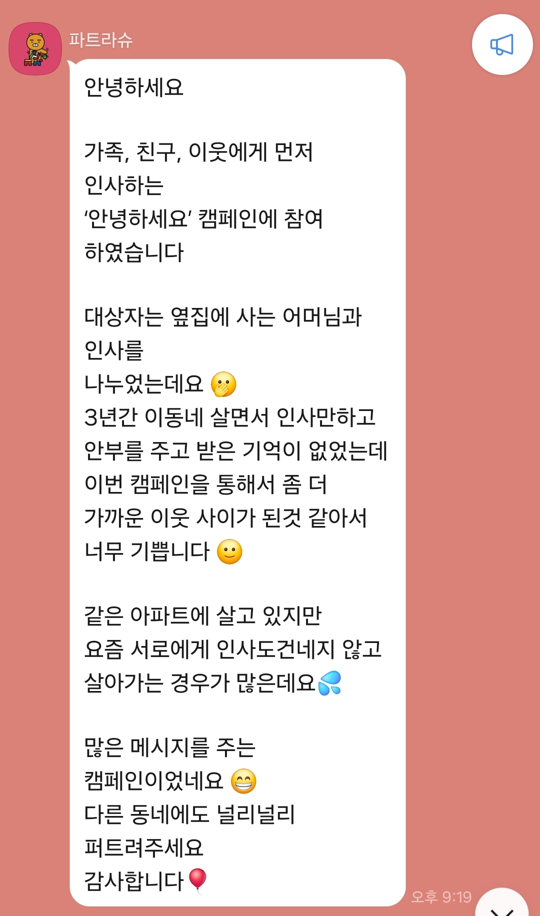 가족 친구 이웃에게 먼저 인사하는 ‘안녕하세요’ 캐페인에 참여했습니다. 옆집에 사는 어머님과 인사를 나누었는데요, 3년간 이동네를 살면서 인사만 하고 안부를 주고 받은 기억이 없었는데 이번 캠페인을 통해 좀 더 가까운 이웃 사이가 된 것 같아서 너무 기쁩니다. 같은 아파트에 살고 있지만 요즘 서로에게 인사도 건네지 않고 살아가는 경우가 많은데요, 많은 메시지를 주는 캠페인이었네요. 다른 동네에도 널리널리 퍼트려 주세요. (파트랴슈)