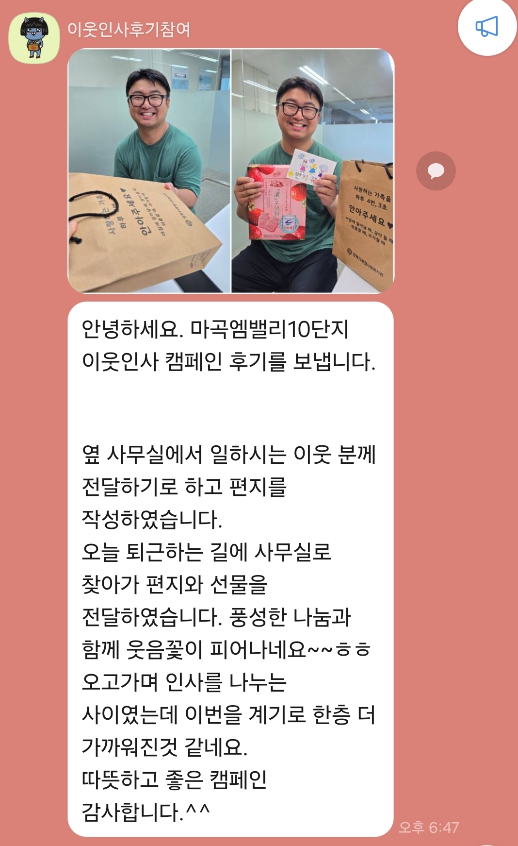 여러 후기에서 이웃인사 캠페인 과정을 보았습니다. 그 모습과 마음이 상상됩니다. 마음이 따뜻해집니다. 후기를 보내준 이웃들에게 관리사무소를 통해 작은 선물을 전달했습니다. 함께한 마곡10단지아파트에 고맙습니다.