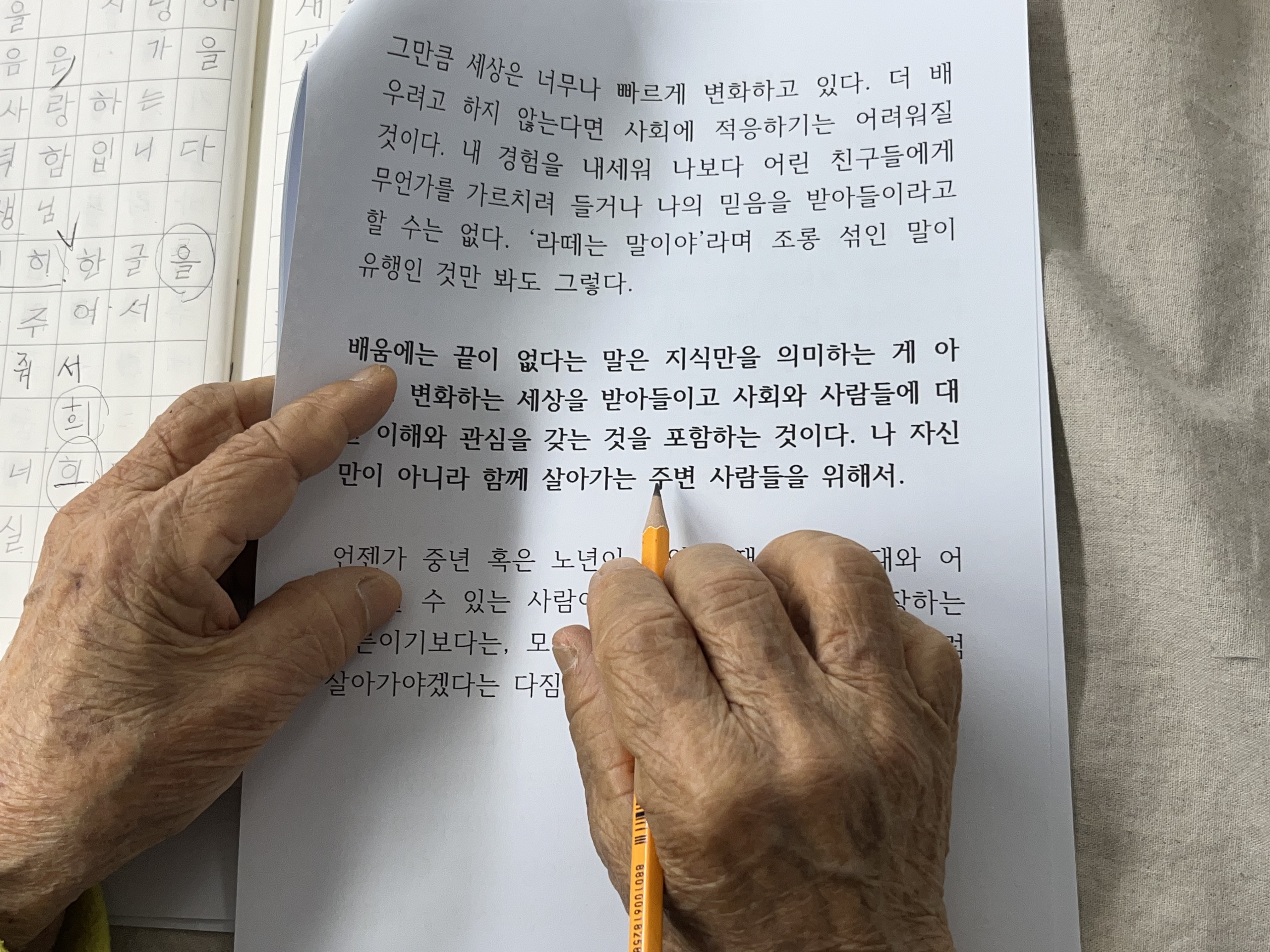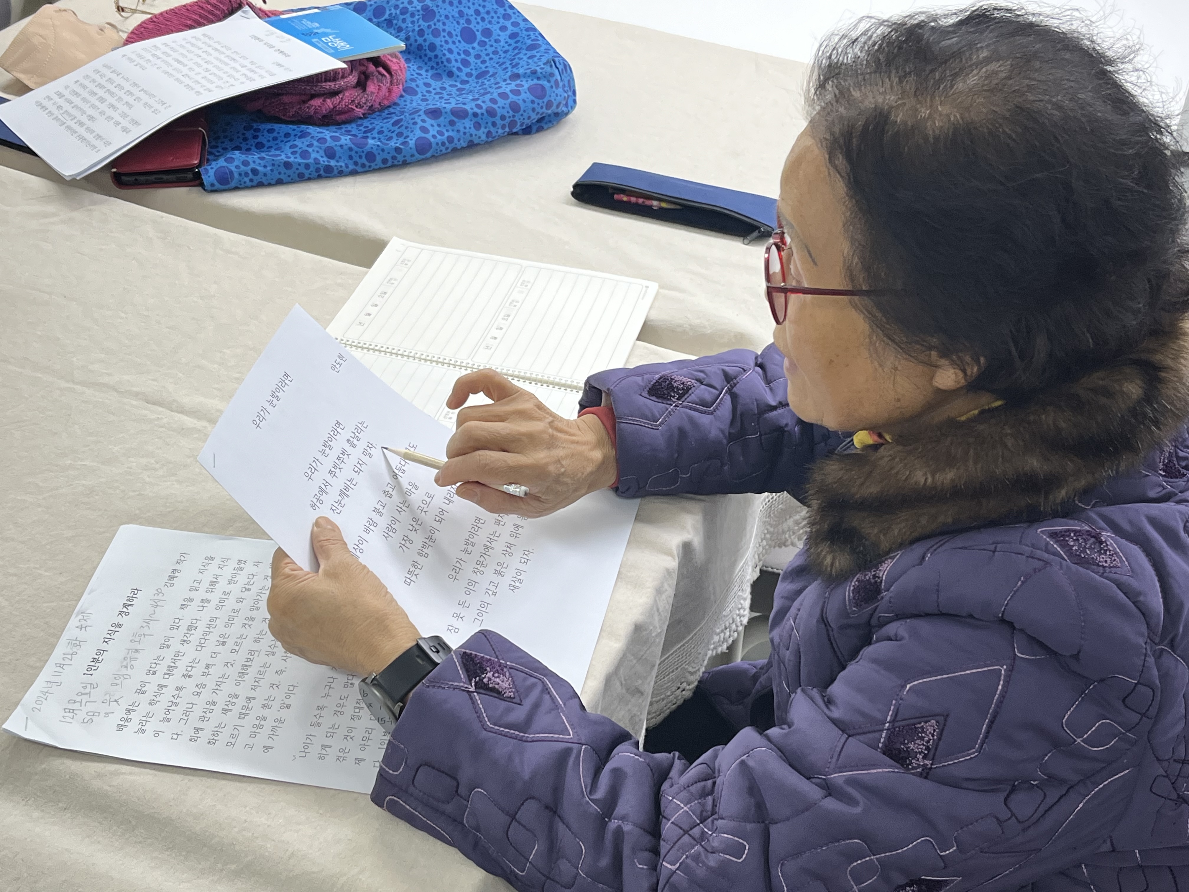“다 늙어서 배운다는 게 창피하긴 하지만 배울 수 있다는 게 얼마나 좋은지 몰라요. 그냥 선생님이 한 사람씩 글을 봐주고 알려줘서 너무 좋아요. 배움의 즐거움을 이루 말할 수 없어요. 나중에 자식들에게 편지도 멋지게 써주고 싶어요. 든든한 언니를 알게 된 것도 고맙고 선생님도 감사해요.”