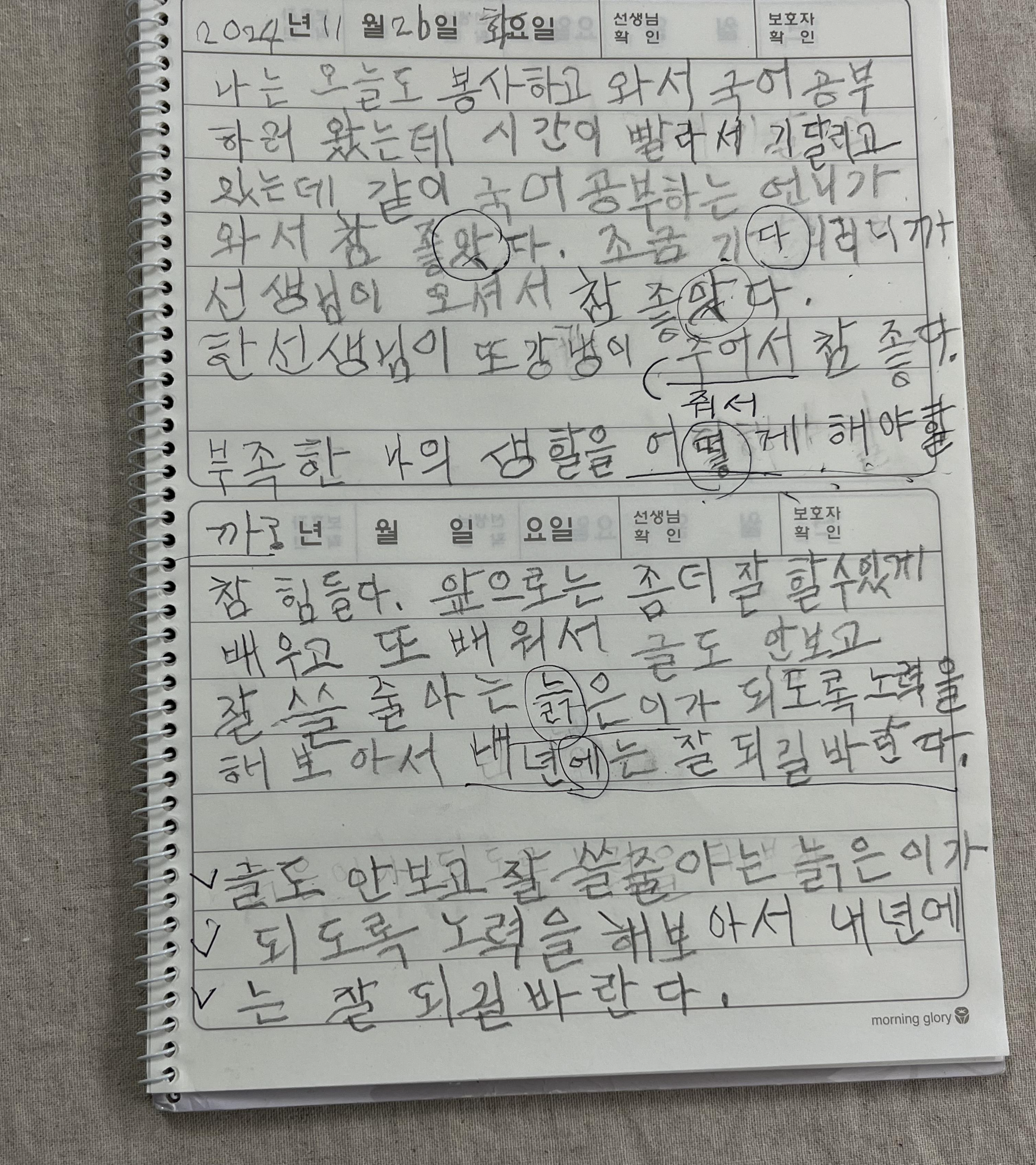 2024년 배움에 대한 열정이 식을 줄 몰랐던 한글배우기 모임 윤OO 어르신, 염OO 어르신과 올 한해 정말 재미있게 모임을 진행했습니다.