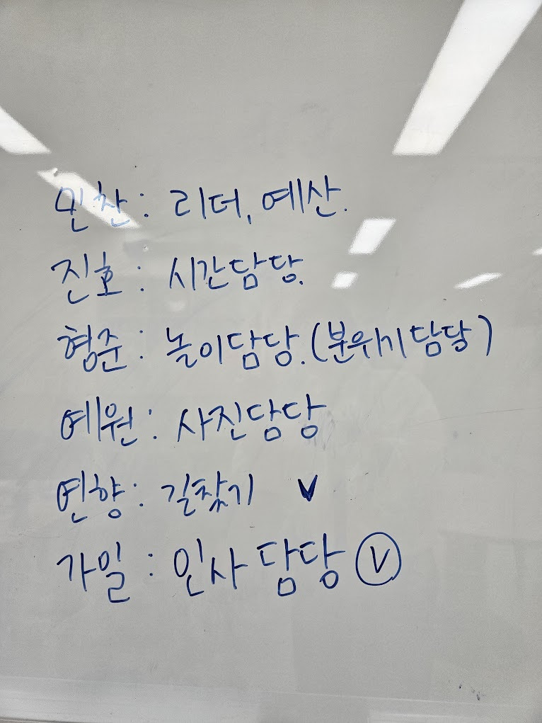 길잡이, 인사 담당, 놀이 담당, 사진 담당, 시간 담당으로 역할을 나눠 여행을 준비했습니다.