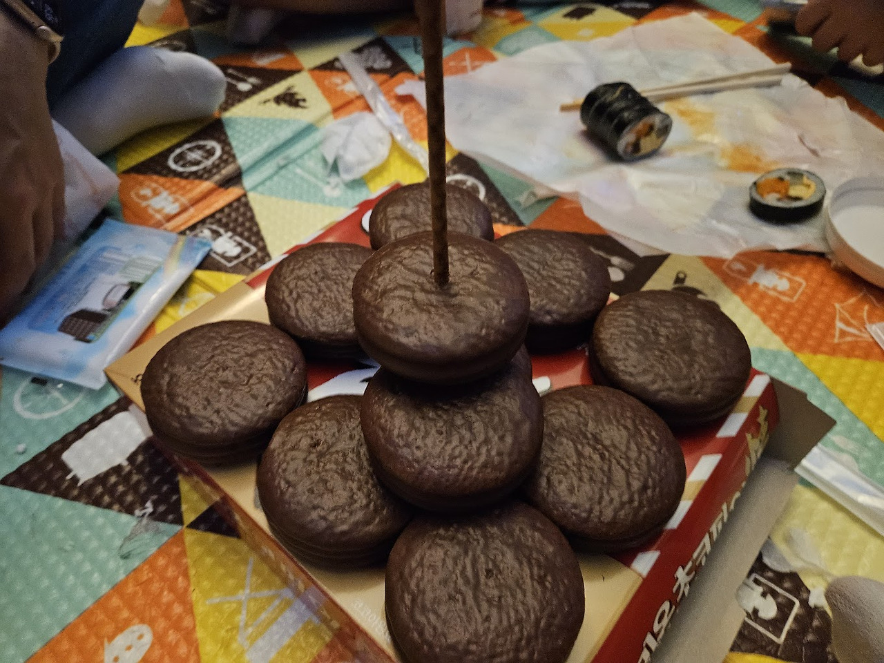 민찬과 정화 선생님께서 초코파이를 사오셨고, 연향과 함께 초코파이로 미니 케이크를 만들었습니다.