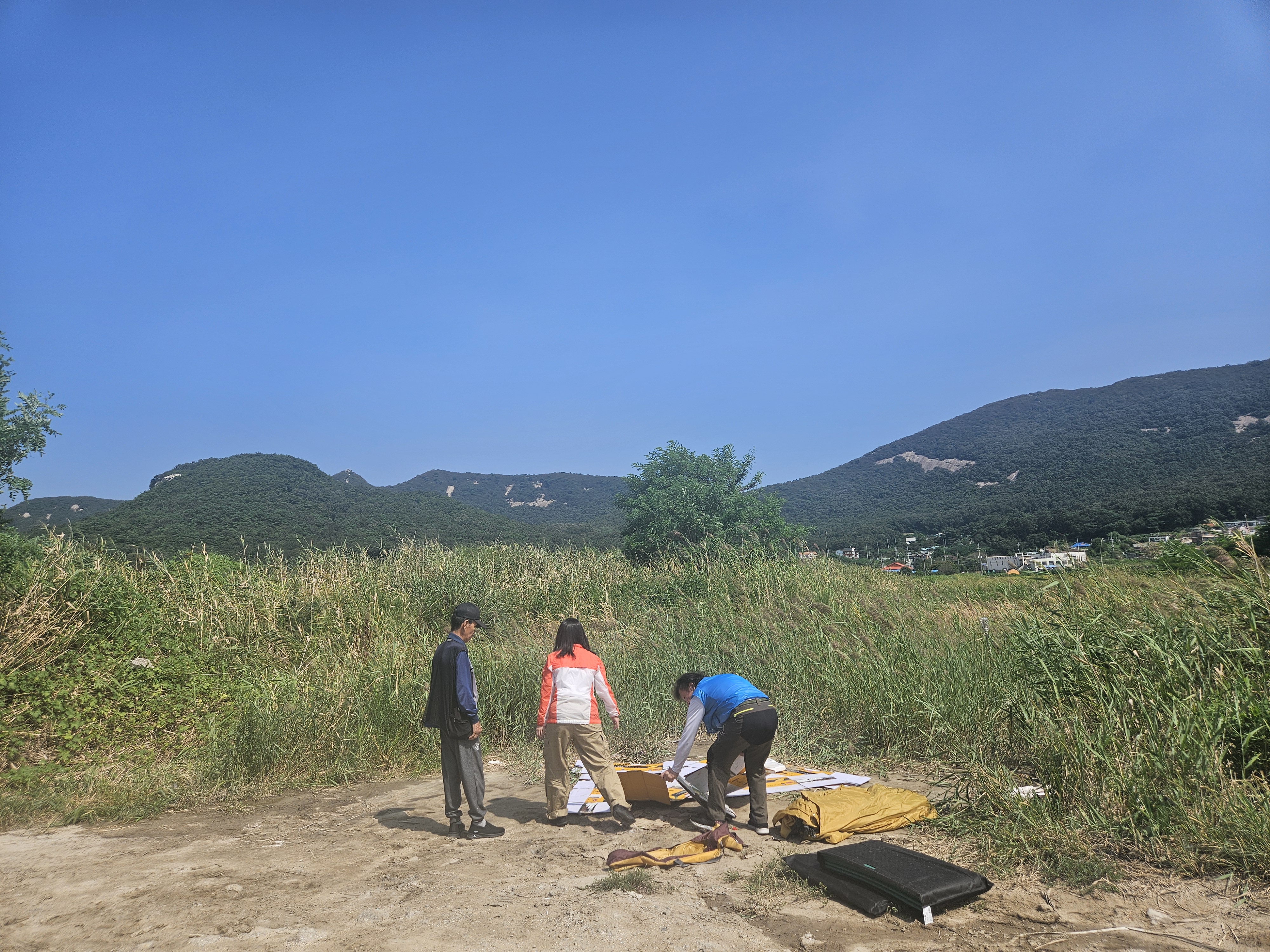 수로에 도착하자마자 낚시대와 발판, 텐트부터 설치하고 함께 식사했습니다.