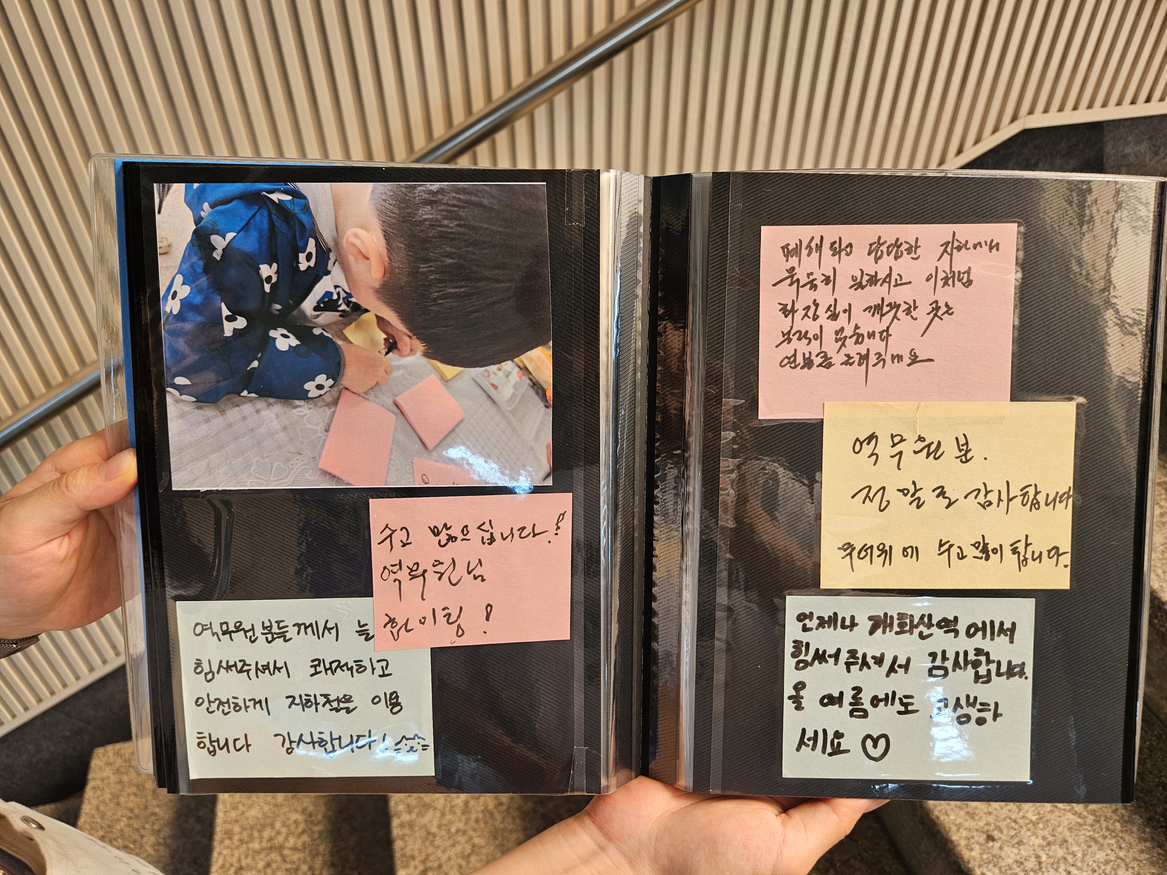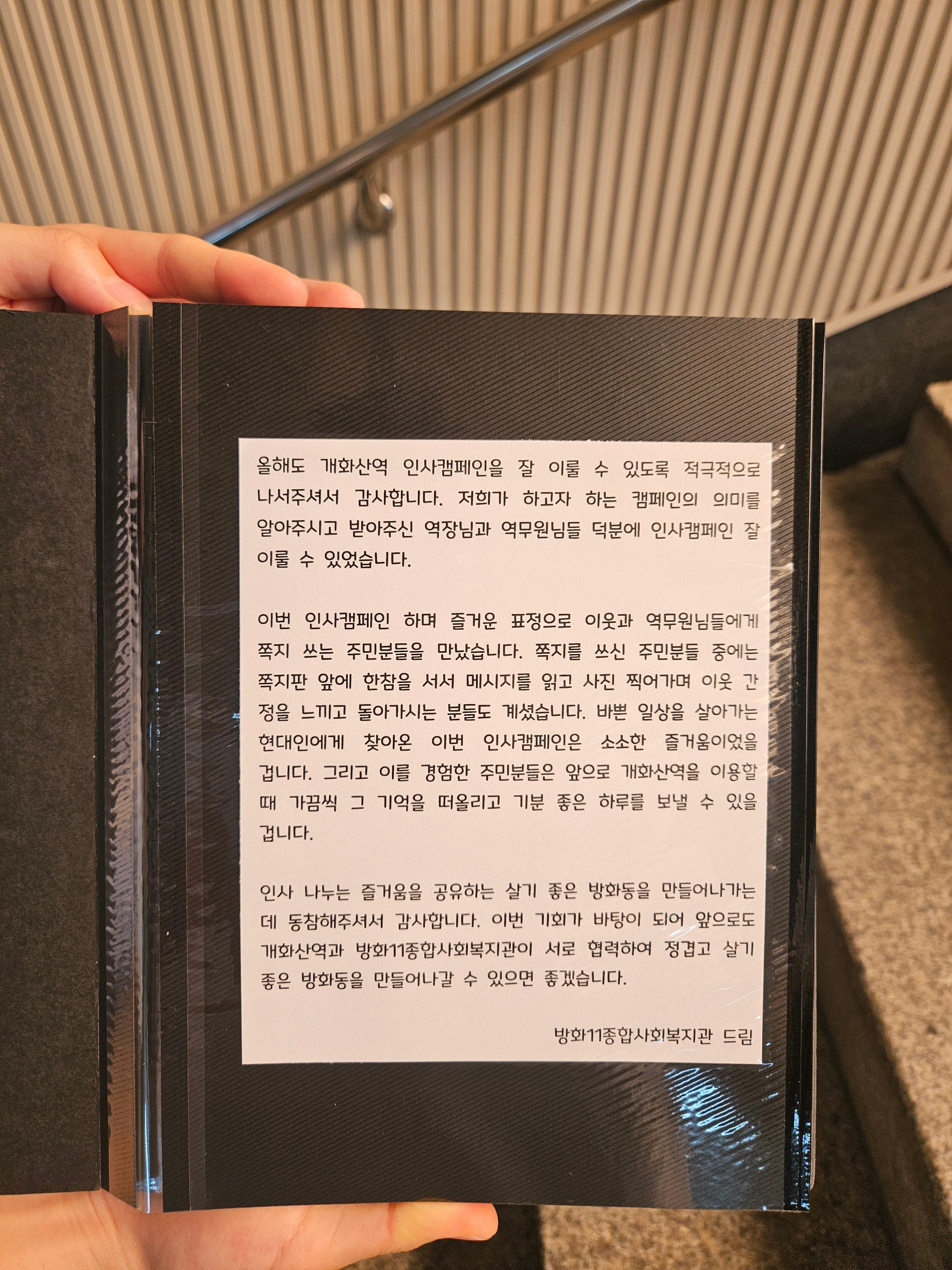 캠페인을 마친 후 역무원 분들께 전하는 감사의 메세지를 정리해 역장님께 전달했습니다.