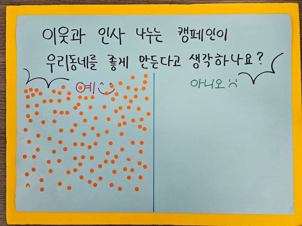 가벼운 인사말 한마디가 지역주민들이 서로에게 관심을 가지고 관계의 시작을 도모할 수 있었으면 좋겠습니다.