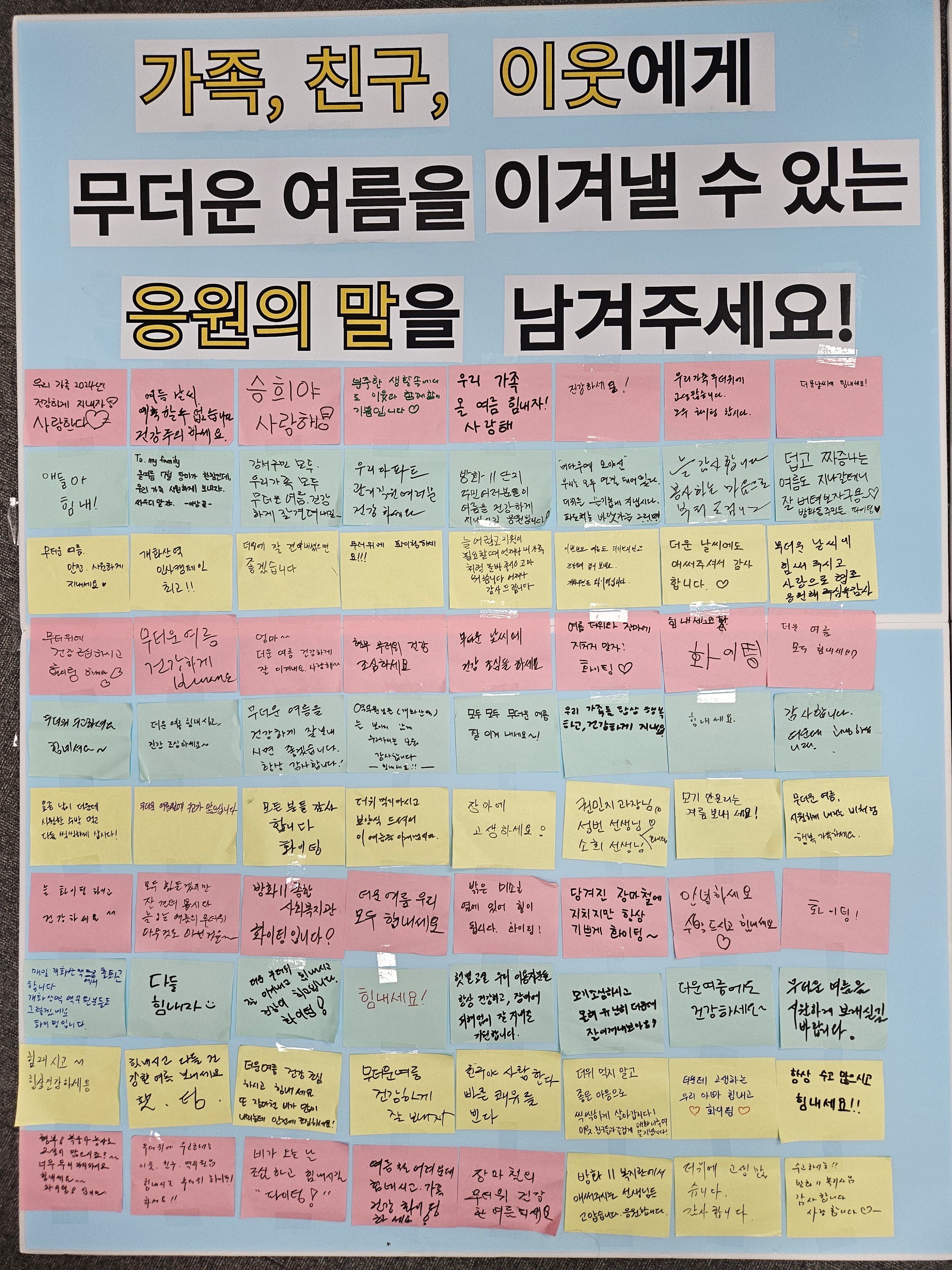 주민분들은 다들 힘내고 무더위가 있더라도 웃으며 즐겁게 지내자며 인사를 남겨주셨습니다.