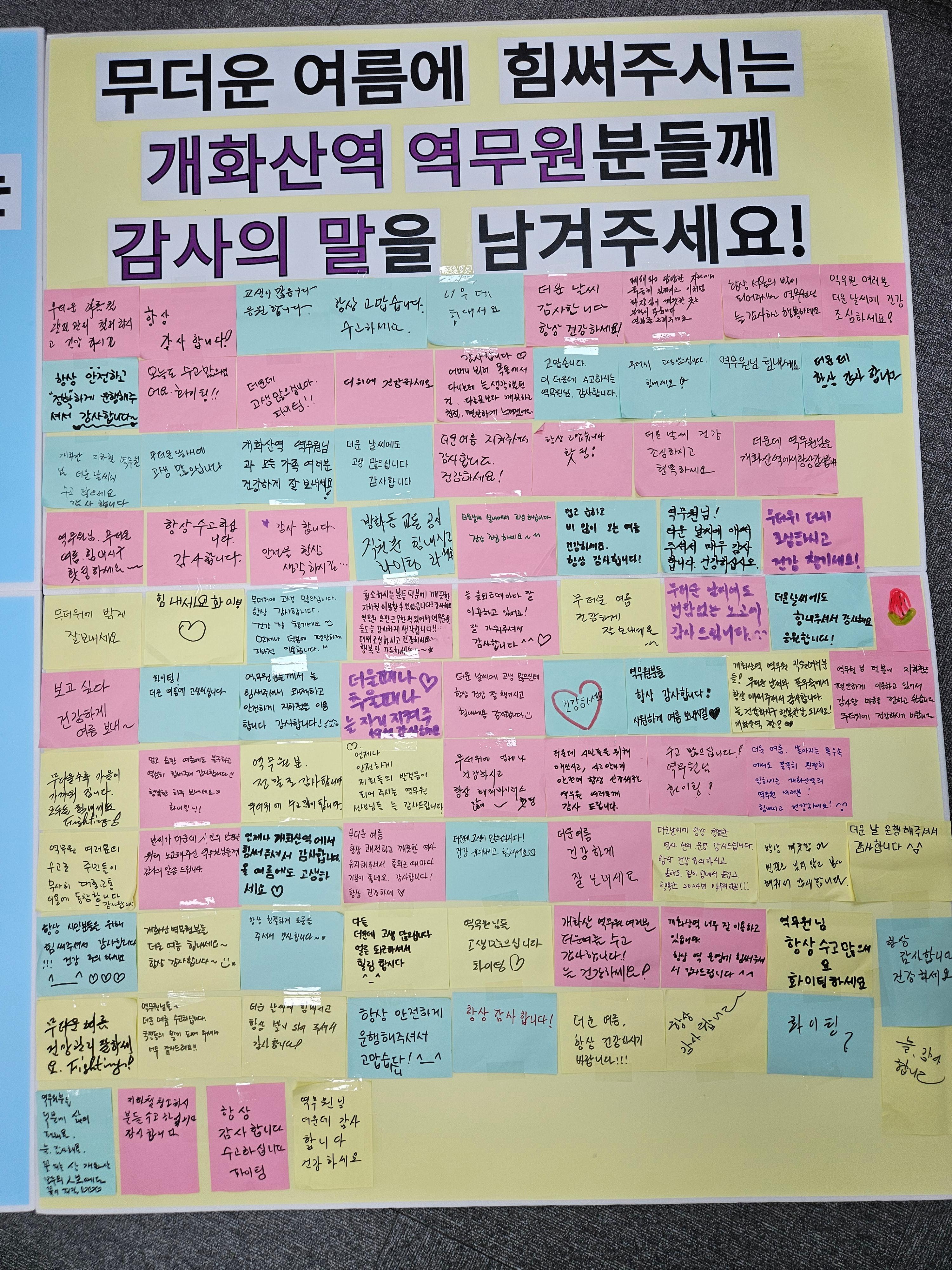 | <역무원님들께 전하는 감사인사말> 무더운 여름철 관절관리 철저하시고 건강하시길 항상 감사합니다! 고생이 많습니다 응원합니다. 항상 고맙습니다. 수고하세요. 더운데 힘내세요 더운 날씨 감사합니다 항상 건강하세요! 폐쇄되고 답답한 지하에서 묵묵히 일하시고 이처럼 화장실이 깨끗한 곳은 본적이 없습니다 연봉 좀 올려주세요 항상 서울의 밤이 되어주시는 역무원님 늘 감사하고 행복하세요 역무원 여러분 더운 날씨에 건강 조심하세요! 항상 안전하고 “정확” 하게 운행해주셔서 감사합니다~ 오늘도 수고 많으셨어요. 파이팅!! 더운데 고생많으십니다. 파이팅!! 더위에 건강하세요 감사합니다 어머니 뵈러 목동에서 다니는데 늘 생각했던 건. 다른 곳보다 깨끗하고 친절, 편안하게 느껴졌어요. 고맙습니다. 이 더운데 수고하시는 역무원님. 감사합니다. 무더위 고생많으십니다. 힘내세요! 역무원님 힘내세요 더운데 항상 감사합니다 개화산 지하쳘 역무원님 더운 날씨에 수고 많으세요 감사합니다 무더운 날씨에 고생 많으십니다 개화산역 역무원님과 모든 가족 여러분 건강하게 잘 보내세요! 더운 날씨에도 고생 많으십니다 감사합니다 더운 여름 지켜주셔서 감사합니다. 건강하세요! 항상 고맙습니다 홧팅! 더운 날씨 건강 조심하시고 행복하세요 더운데 역무원님들 개화산역에서 항상 감사합니다 역무원님. 무더운 여름. 힘내시구 홧팅하세요~ 항상 수고하십니다. 감사합니다. 감사합니다 안전을 항상 생각하시길... 방화동 교통공사 직원분 힘내시고 파이팅 하세요 더운 날씨 실내에서 고생하십니다 건상 조심하세요~^^ 덥고 습하고 비 많이 오는 여름 건강하세요. 항상 감사합니다! 역무원님! 더운 날씨에 애써주셔서 매우 감사합니다. 건강하십시오. 무더위 더위 조심하고 건상 챙기세요! 무더위에 밝게 잘보내세요 힘내세요 파이팅 무더위에 고생 많으십니다. 항상 감사합니다. 건강 잘 챙기세요 ^^ 언제나 덕분에 편안하게 지하철 이용합니다.^^ 청소하시는 분들 덕분에 깨끗한 지하철 이용할 수 있었습니다! 감사해요 역무원 잠깐 근무한 적 있어서 역무원분들도 늘 감사하게 생각합니다!! 더위 조심하시고 건강하세요~ 행복만 가득하세요~~ 늘 출퇴근때마다 잘 이용하고 있어요! 잘 가꿔주셔서 감사합니다^^ 무더운 여름 건강하게 잘보내세요~~ 무더운 날씨에도 변함없는 노고에 감사드립니다^^ 더운 날씨에도 힘내주셔서 감사해요 응원합니다! 보고싶다 건강하게 여름 보내~ 파이팅! 더운 여름에 고생하십니다 역무원분들께서 늘 힘써주셔서 쾌적하고 안전하게 지하철을 이용합니다 감사합니다! 더울 때나 추울 때나 늘 자리 지켜주셔서 감사해요 더운 날씨에 고생 많으신데 항상 건강 잘 챙기시고 힘내세용 감사합니다 건강하세요 역무원분들 항상 감사합니다! 시원하게 여름 보내시길 개화산역 역무원 직원 여러분들! 무더운 날씨와 폭우속에서 항상 애써주셔서 감사합니다. 늘 건강하시고 행복한 날 되세요! 개화산역 짱! 역무원님 덕분에 지하철을 편안하게 이용하고 있어서 감사한 마음을 전하고 싶습니다 무더위에 건강하시기 바랍니다 무더울수록 마음이 가까워집니다. 모두들 힘내세요 Fighting! 덥고 습한 여름에도 불구하고 열심히 힘써주셔 감사합니다^^ 행복한 하루 보내세요 파이팅~!! 역무원분 정말로 감사합니다 무더위에 수고 많이 합니다. 언제나 안전하게 저희들의 발걸음이 되어주시는 역무원 선생님들 늘 감사드립니다. 무더위에 언제나 건강하시고 항상 해피바이러스 많이~ 홧팅 더운데 시민들을 위해 애쓰시고, 사고 안나게 안전에 항상 신경써주는 역무원 여러분께 감사드립니다. 수고많으십니다! 역무원님 파이팅! 더운 여름. 쏟아지는 폭우 속에서도 묵묵히 친절히 일하시는 개화산역의 역무원 여러분! 힘내시고 건강하세요! ^^ 역무원 여러분의 수고로 주민들이 무사히 대중교통 이용에 동참합니다 – 감사합니다- 날씨가 더운데 시민의 안전을 위해 노고해주신 역무원님들께 감사의 말씀 드립니다. 언제나 개화산역에서 힘써주셔서 감사합니다. 올여름에서 고생하세요 무더운 여름 항상 쾌적하고 깨끗한 역사 유지해주셔서 출퇴근 때마다 기분이 좋네요. 감사합니다! 항상 건강하세 더운데 고생이 많으십니다! 건강 유의하고 힘내세요 더운 여름 건강하게 잘 보내세요 더운 날씨에 항상 청결한 역사 관리, 운영 감사드립니다. 항상 건강 유의하고 올해도 같이 힘내서 즐겁고 행복한 2024년 마무리하길!! 항상 깨끗함과 친절한 잊지 않고 봉사 해줘서 감사합니다. 더운 날 운행해주셔서 감사합니다 항상 시민들을 위해 힘써주셔서 감사합니다!!! 건강 주의하세요^-^ 개화산 역무원분들 더운 여름 힘내세요~ 항상 감사합니다~ 항상 친절하게 도움을 주셔서 감사합니다~ 다들 더운데 고생 많으십니다 얼른 퇴근하셔서 힐링 합시다^-^ 역무원님들 고생많으십니다 파이팅 개화산 역무원 여러분 더운 여름 수고 감사합니다! 늘 건강하세요! 개화산역 너무 잘 이용하고 있습니다. 항상 역 운영에 힘써주셔서 감사드립니다^^ 역무원님 항상 수고 많으세요 파이팅 하세요 항상 감사합니다 건강