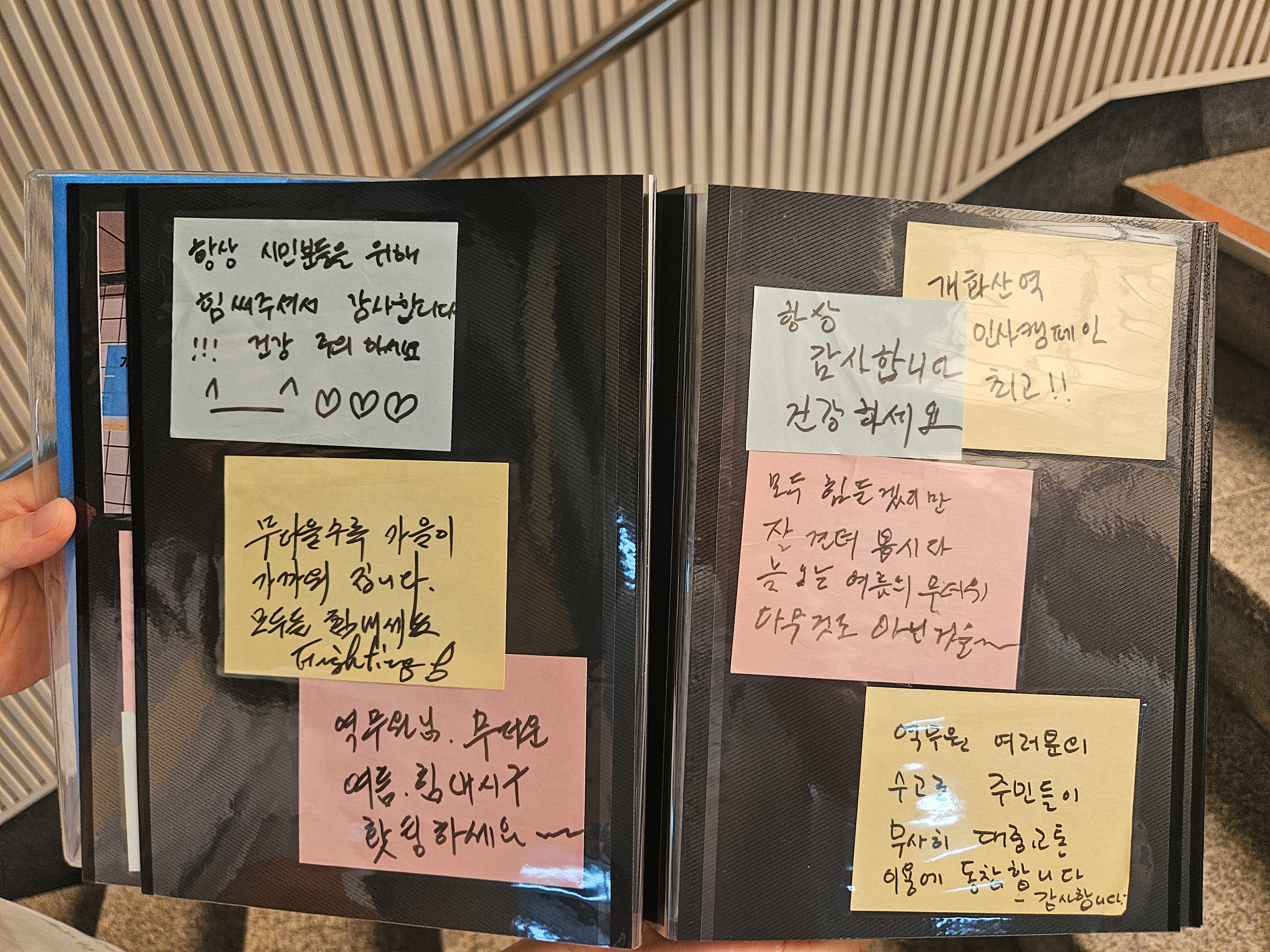 캠페인을 마친 후 역무원 분들께 전하는 감사의 메세지를 정리해 역장님께 전달했습니다.