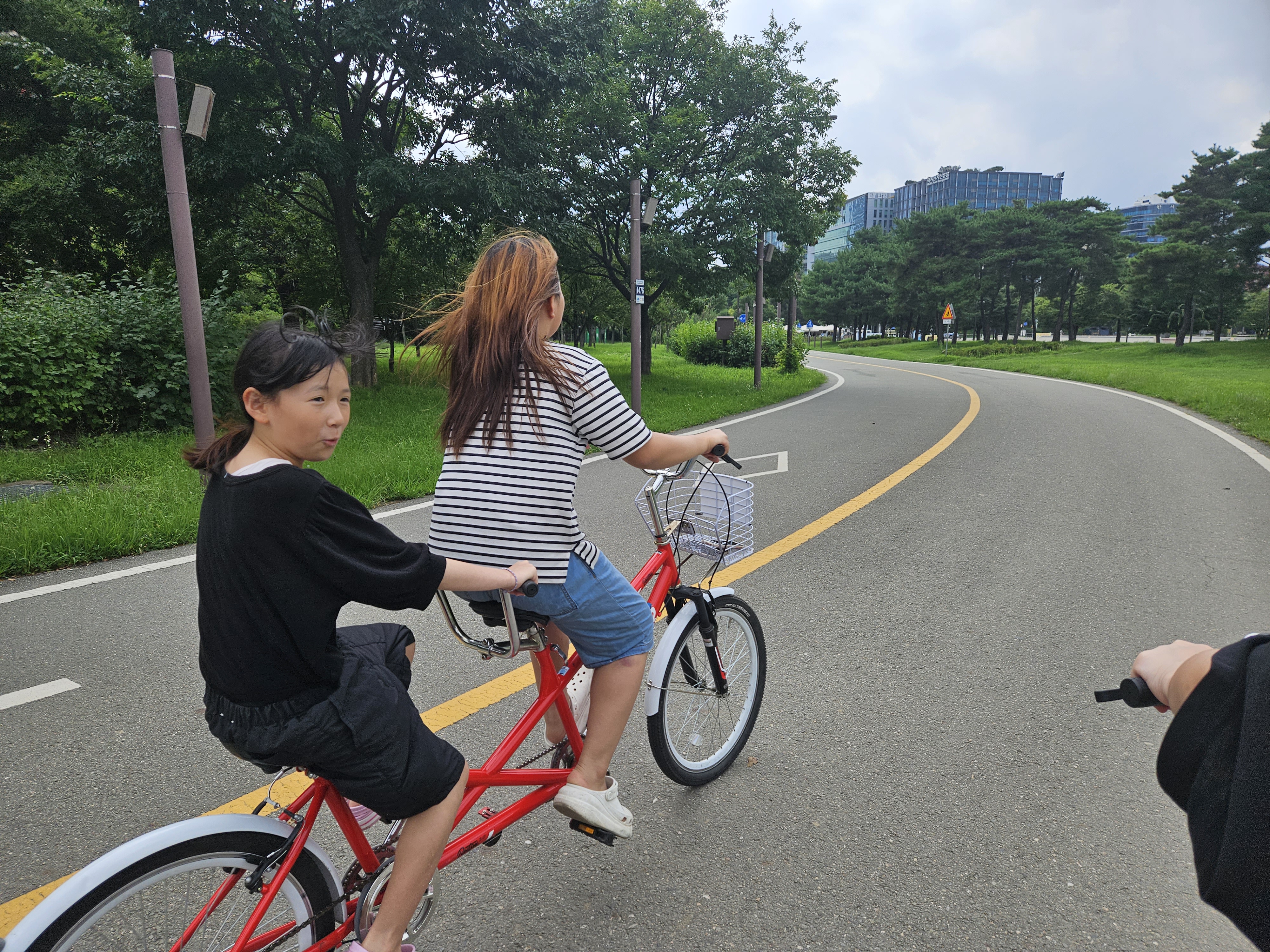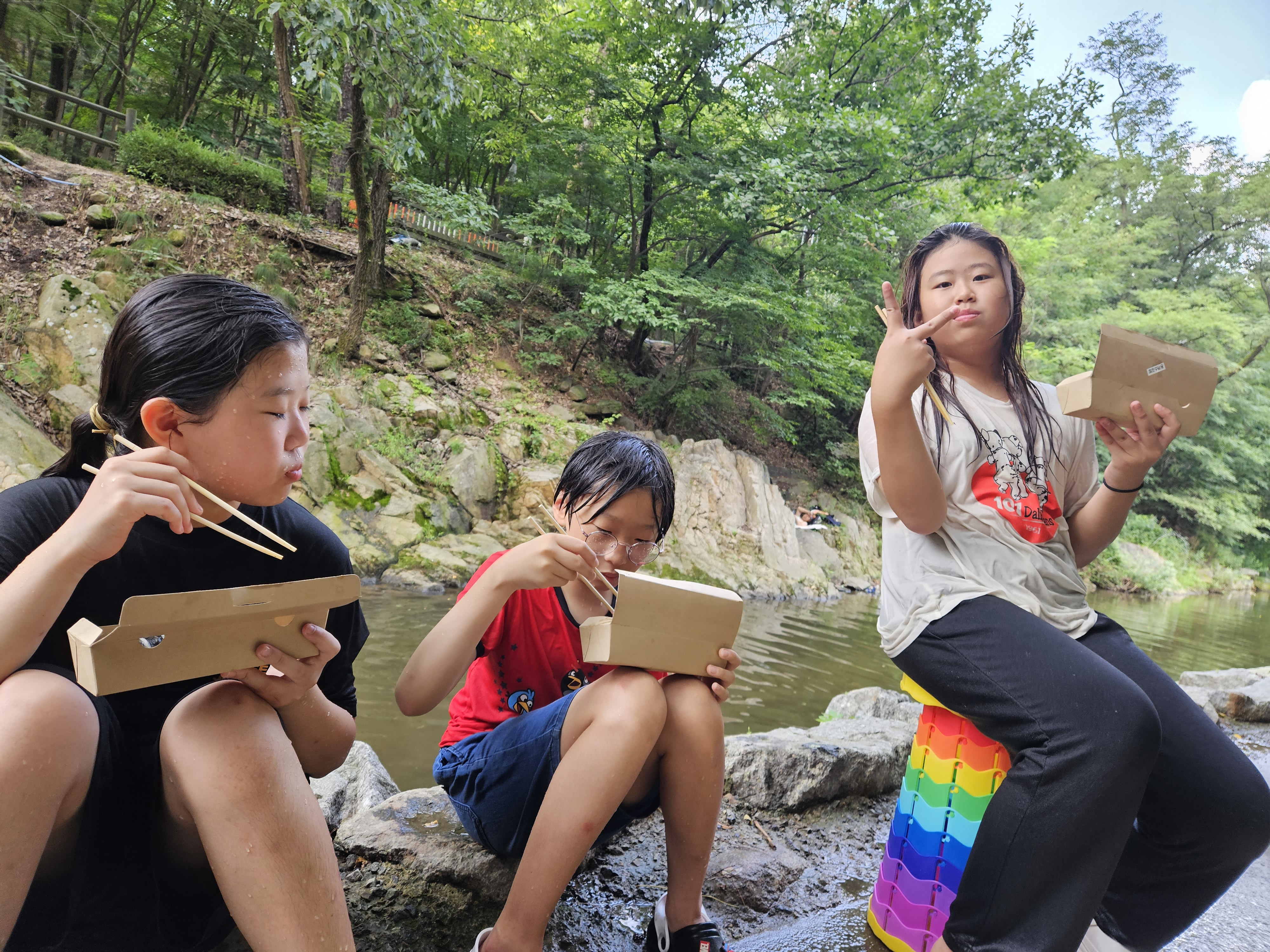 물길을 따라 다리 밑에 도착해서 돗자리를 펴고 둘러앉아 분식을 시켜먹기도 하고, 서로를 끌어주며 물놀이를 신나게 즐겼습니다. 한강 자전거도 빌려서 타고 놀이터에서 짚라인을 타며 놀았습니다.