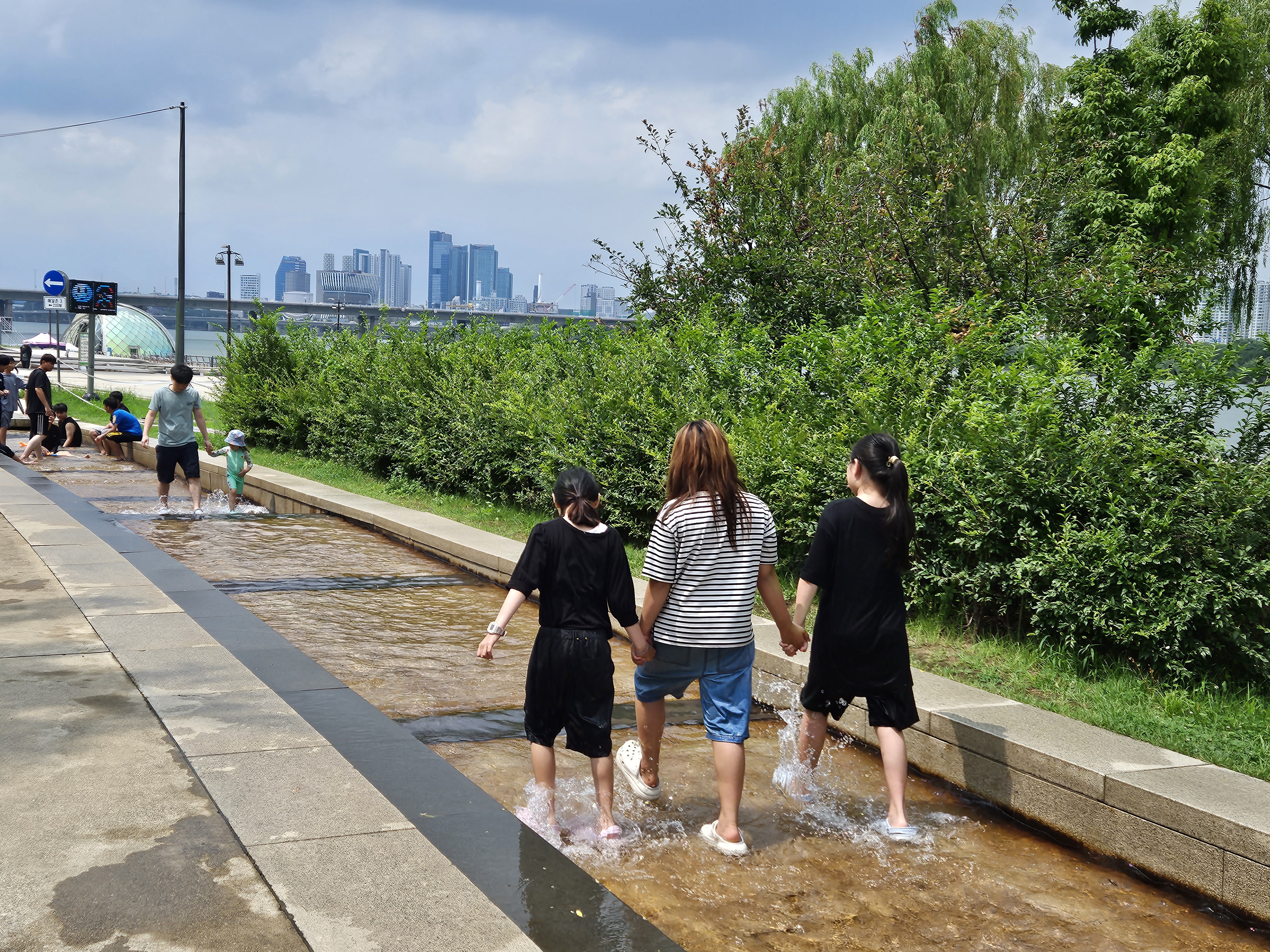 한강에 도착했습니다. 피아노 물길을 따라 신발을 벗고 시원하게 걸었습니다.