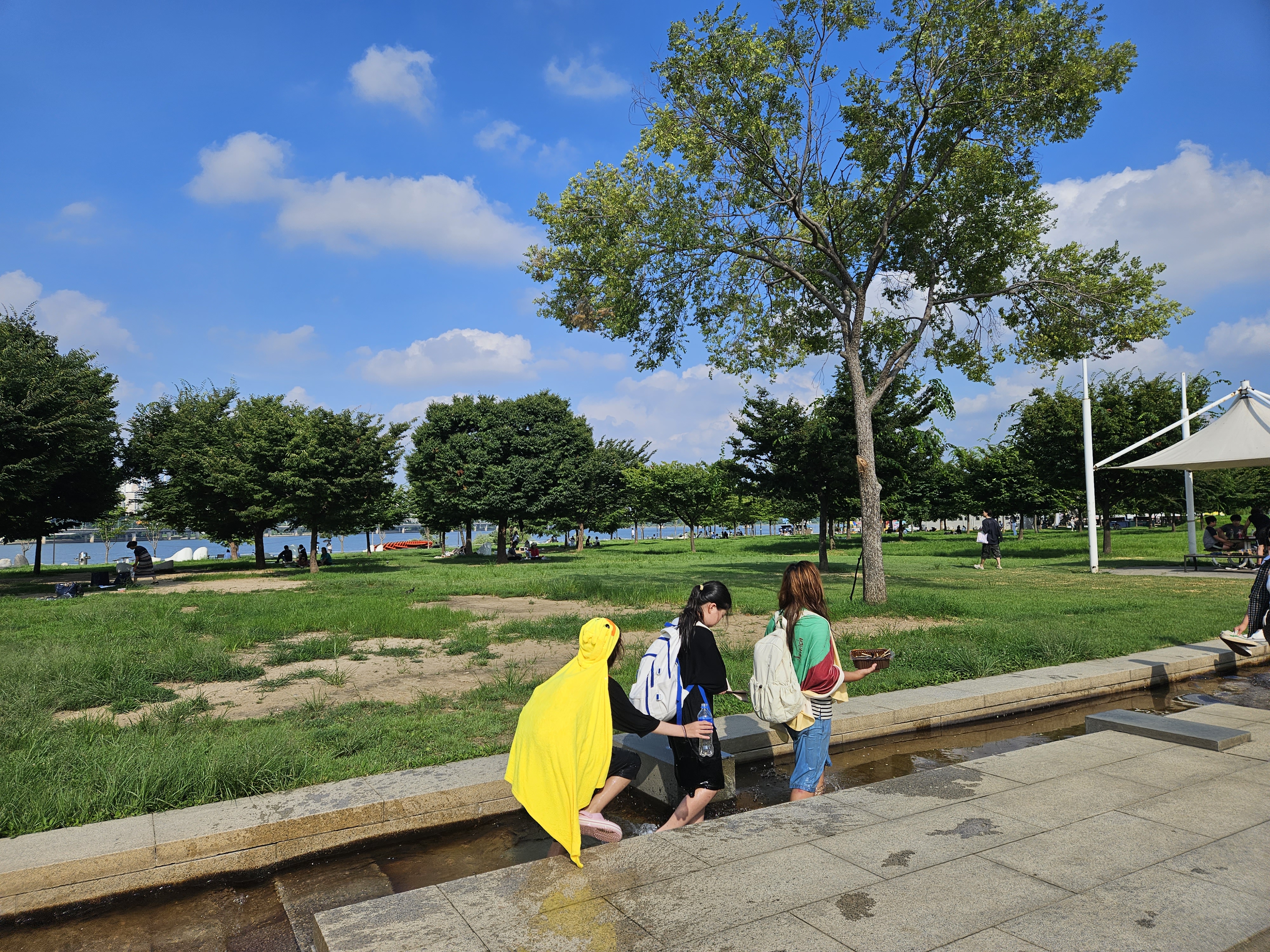 한강에 도착했습니다. 피아노 물길을 따라 신발을 벗고 시원하게 걸었습니다.