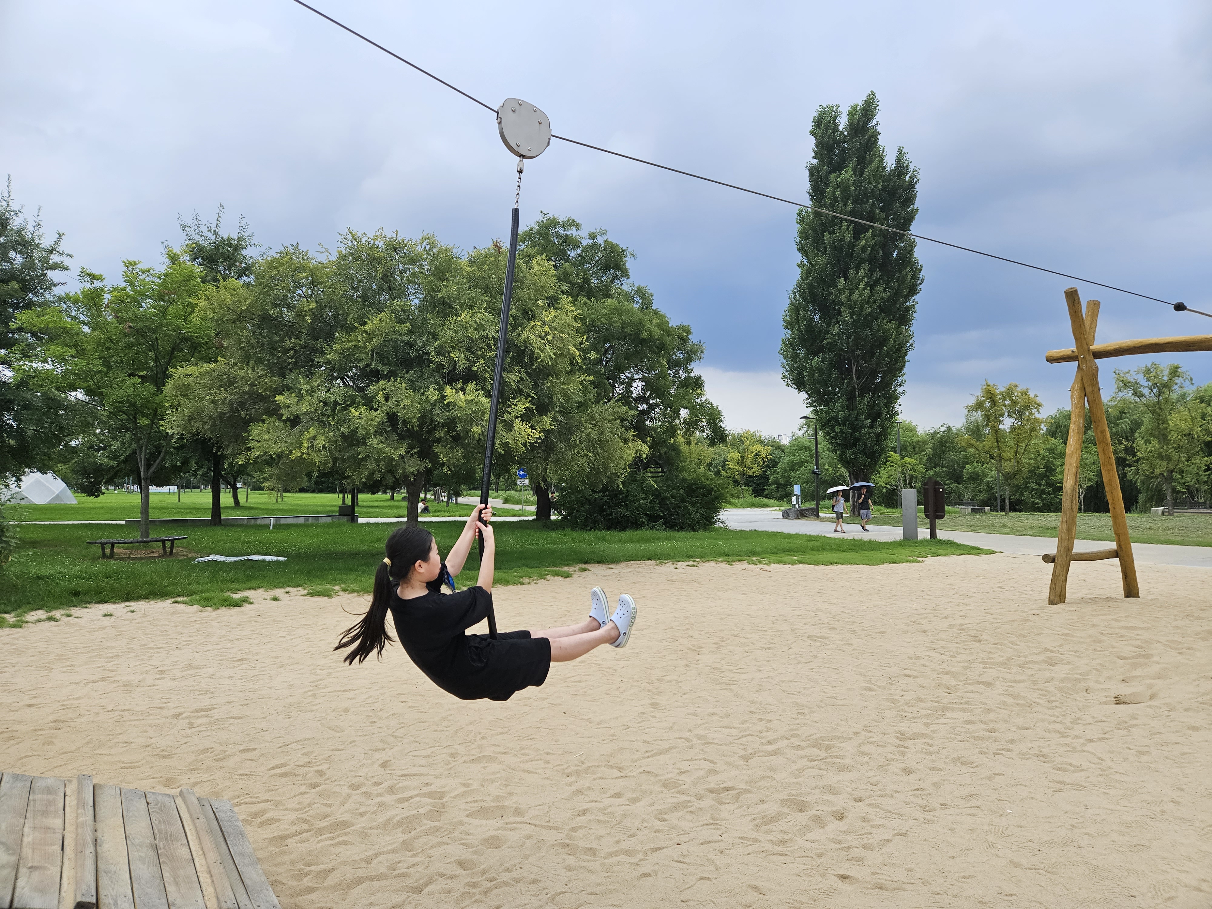 물길을 따라 다리 밑에 도착해서 돗자리를 펴고 둘러앉아 분식을 시켜먹기도 하고, 서로를 끌어주며 물놀이를 신나게 즐겼습니다. 한강 자전거도 빌려서 타고 놀이터에서 짚라인을 타며 놀았습니다.