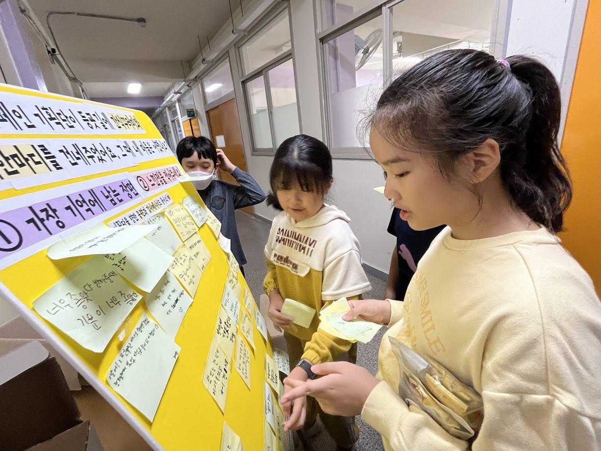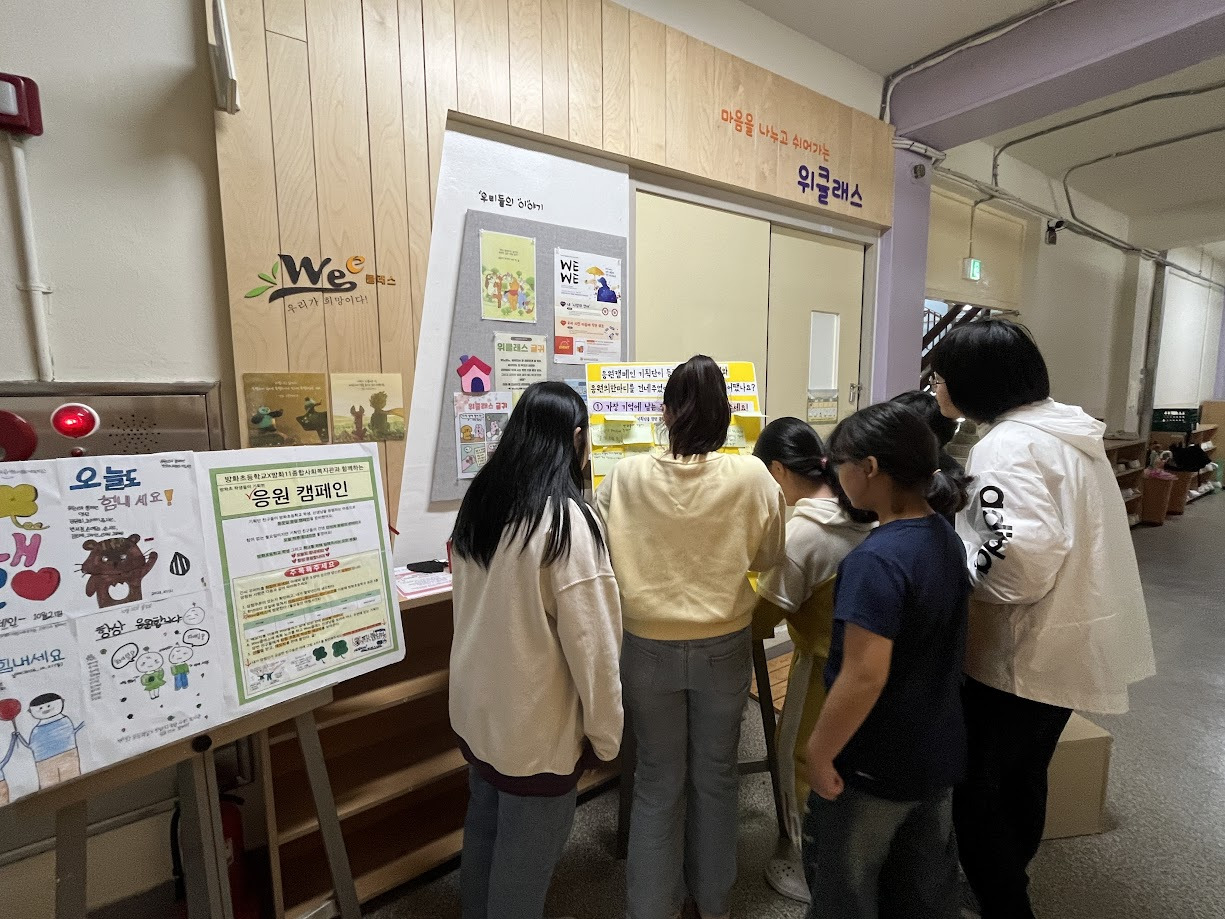 '당첨' 쿠폰을 받은 친구들은 Wee클래스 앞에 있는 소감판에 소감을 작성하고 간식을 받아가기로 했습니다.