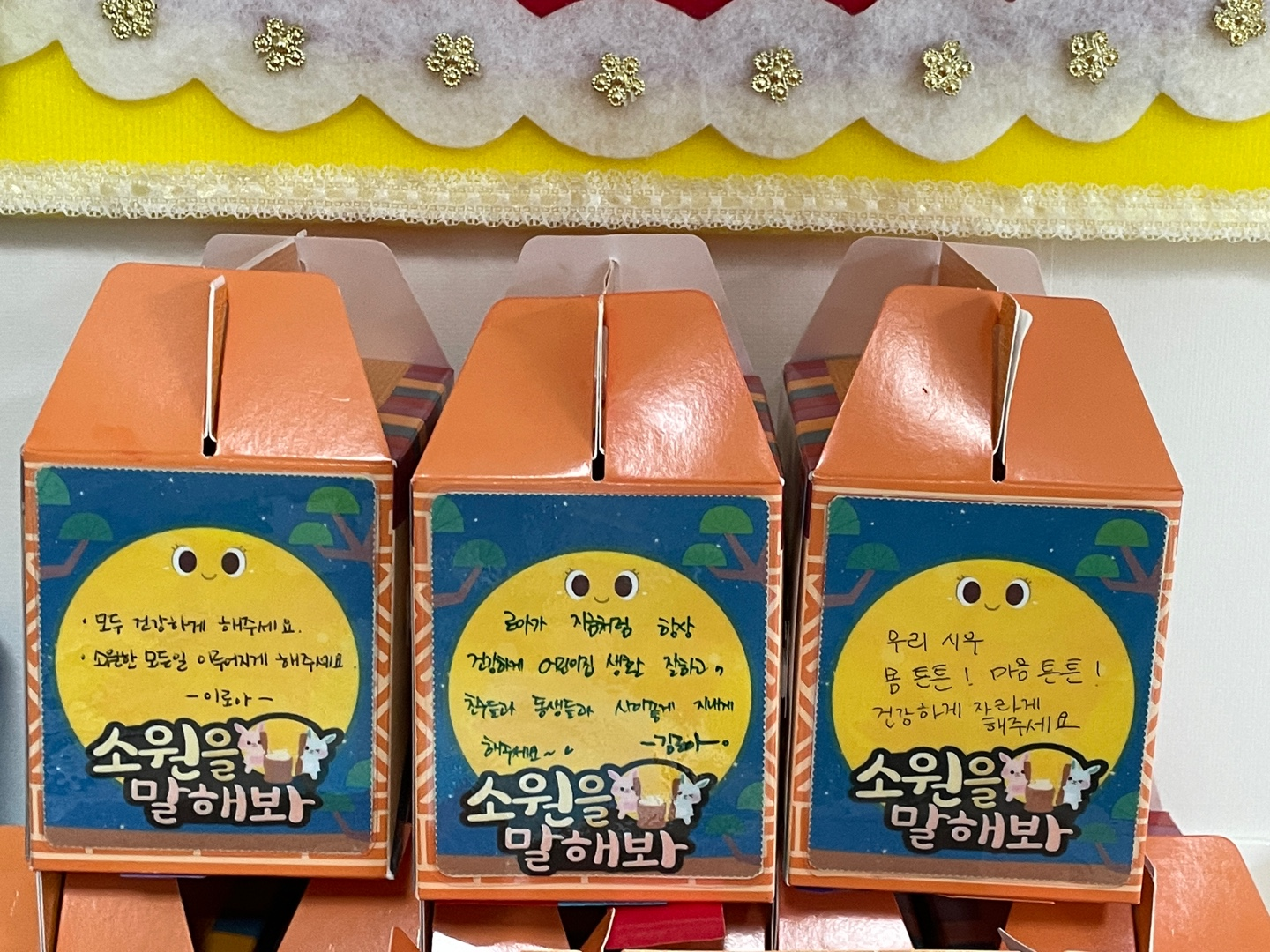 아이들도 꾸러미에 전통 무늬 스티커와 색종이를 붙여 꾸몄습니다.