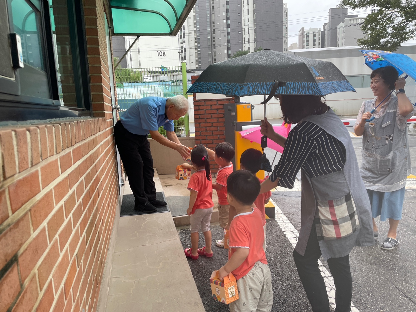 자연어린이집 4세 반 원아들이 자연어린이집 원아들 대표로 해태아파트 경비원분들에게 송편 꾸러미 전달했습니다.