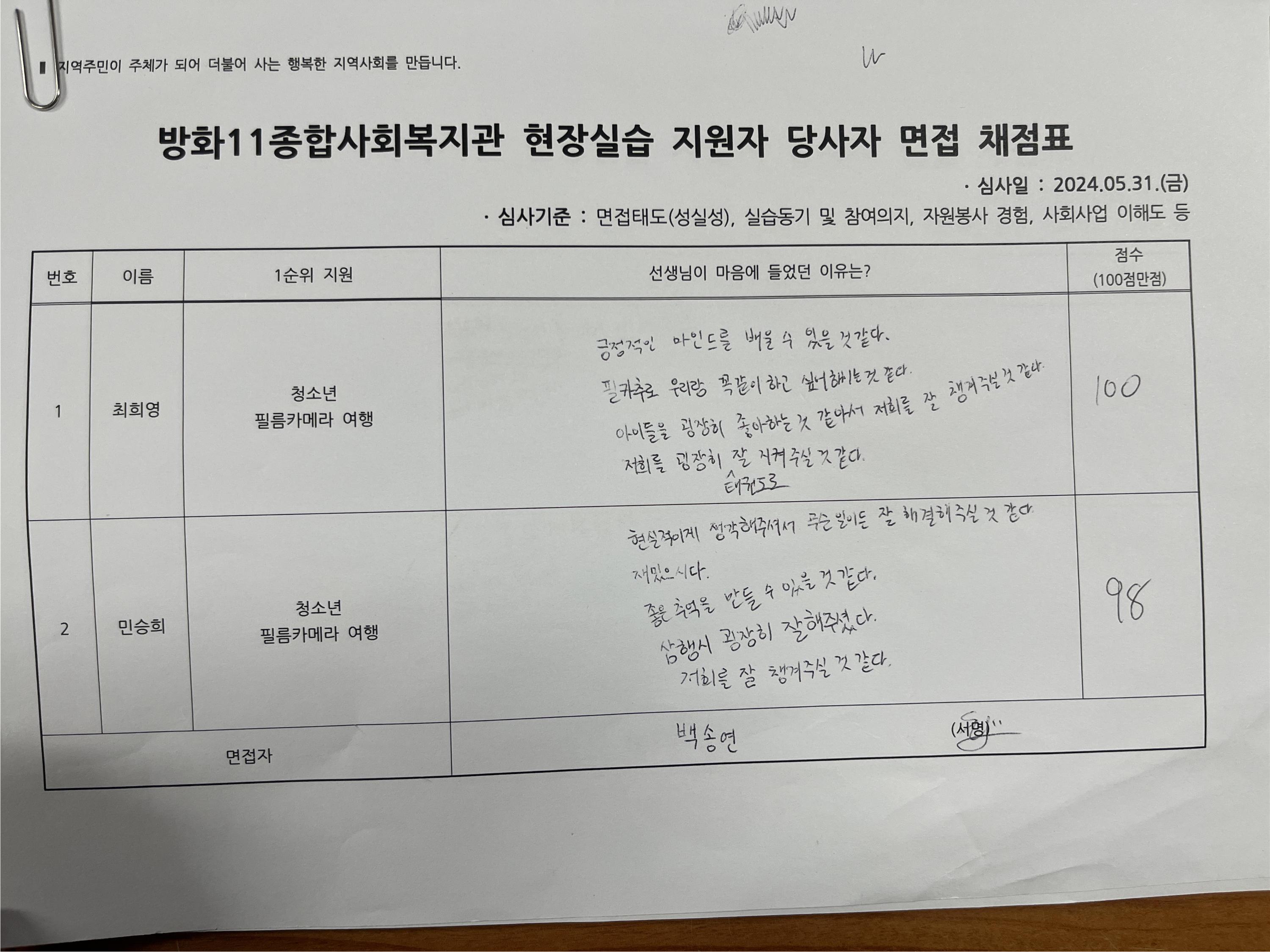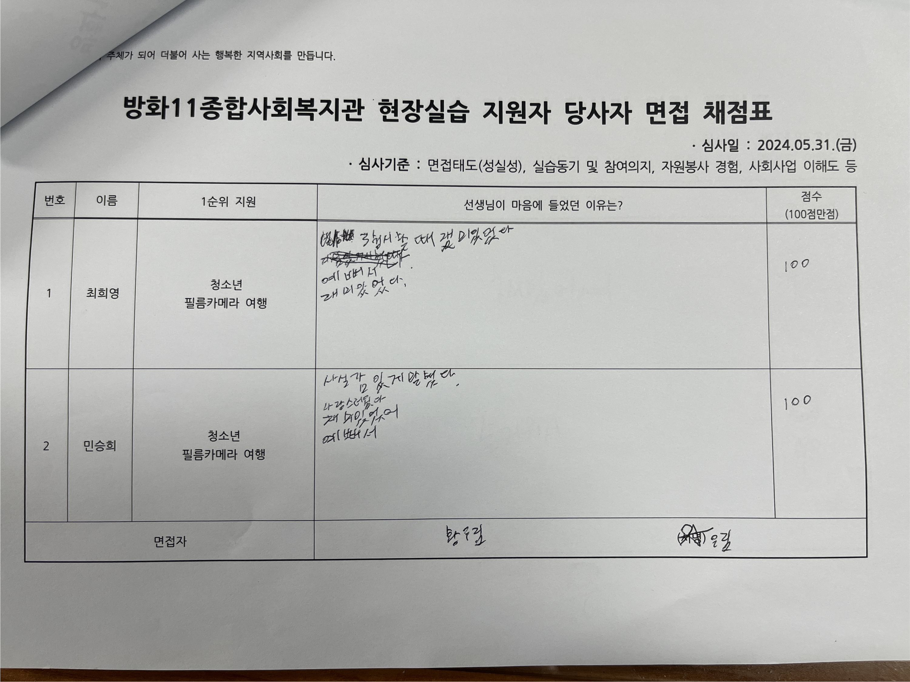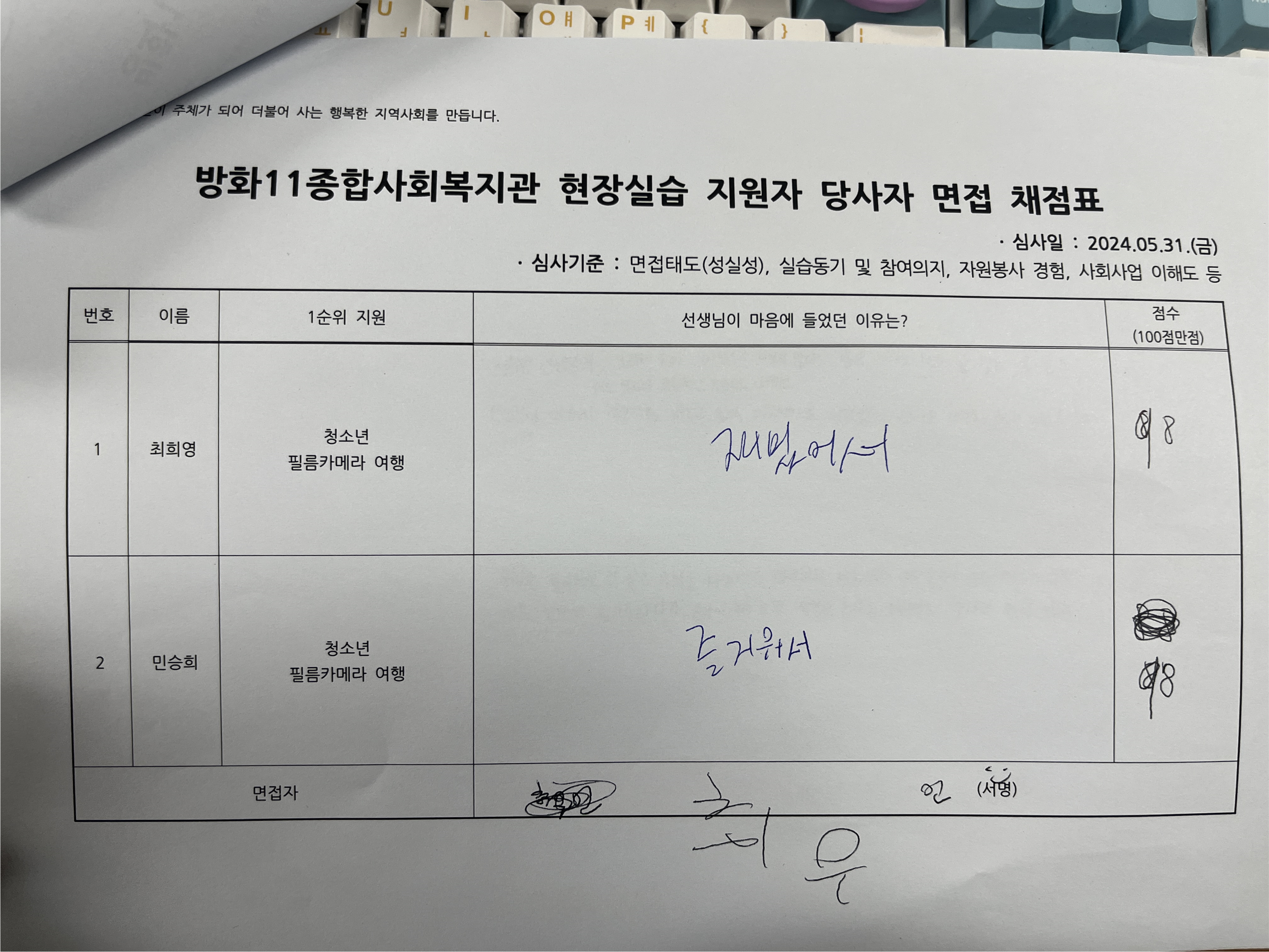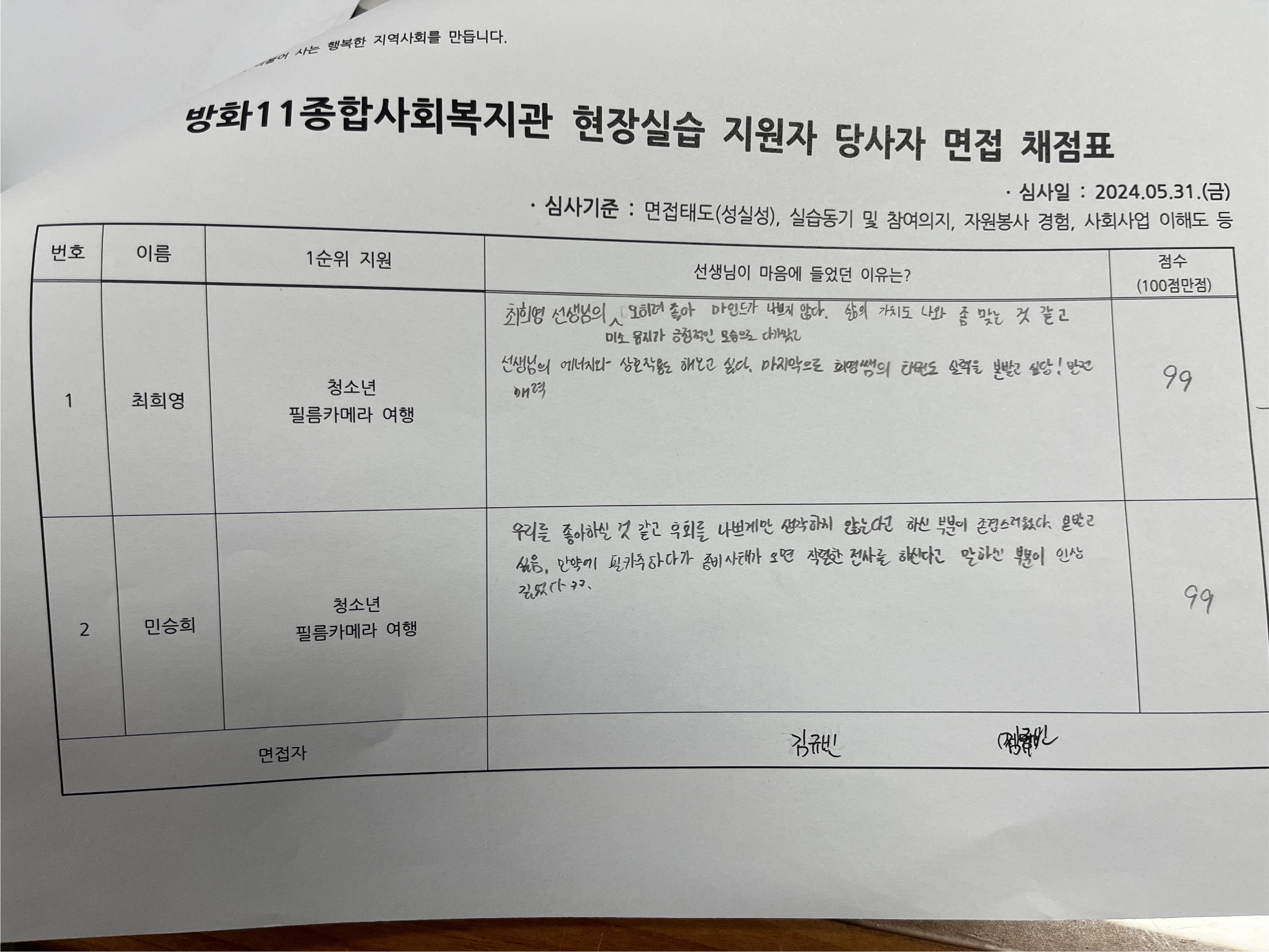 여름동안 함께 출사활동을 다닐 실습 선생님 면접을 준비하고 면접 진행했습니다.