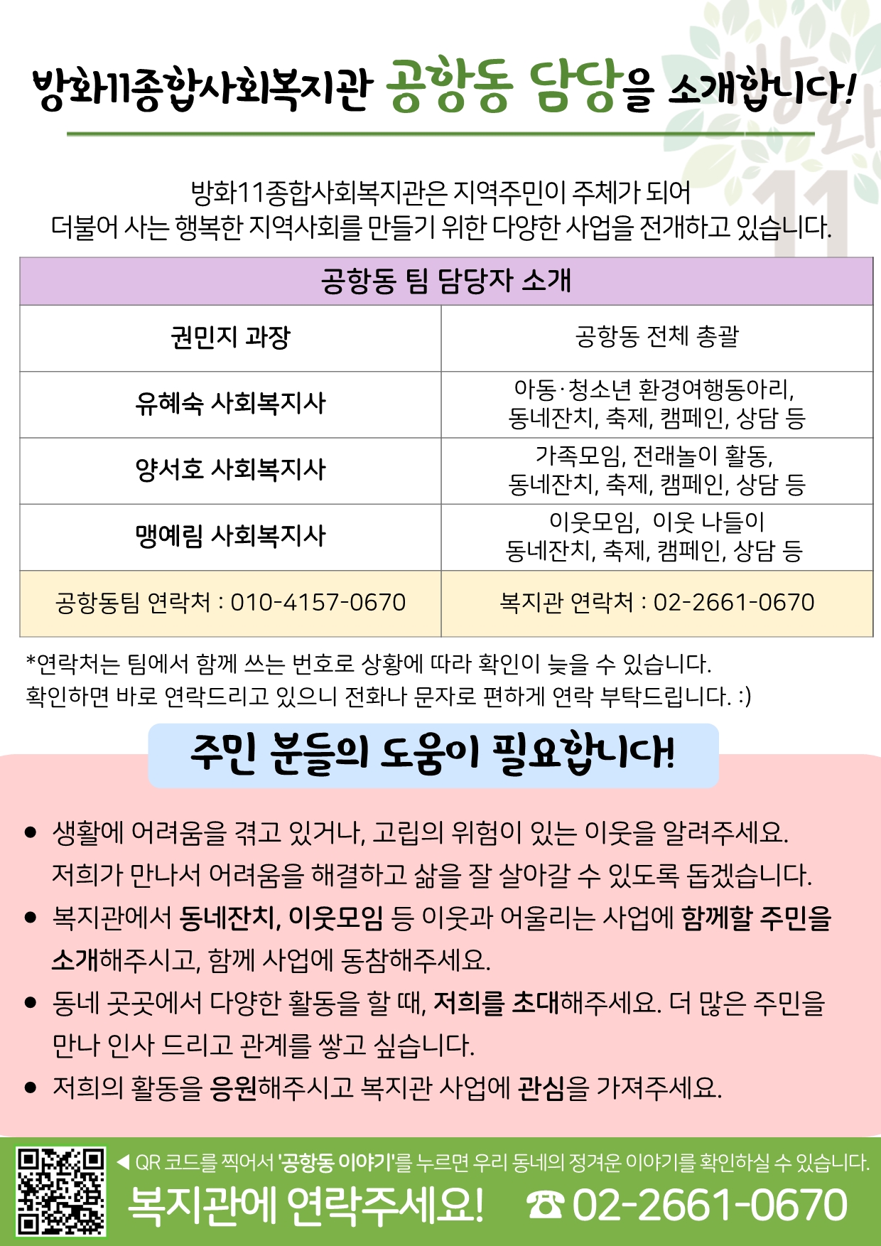 방화11종합사회복지관 공항동 담당 소개지와 작은 꾸러미를 선물로 전달해 드렸습니다.