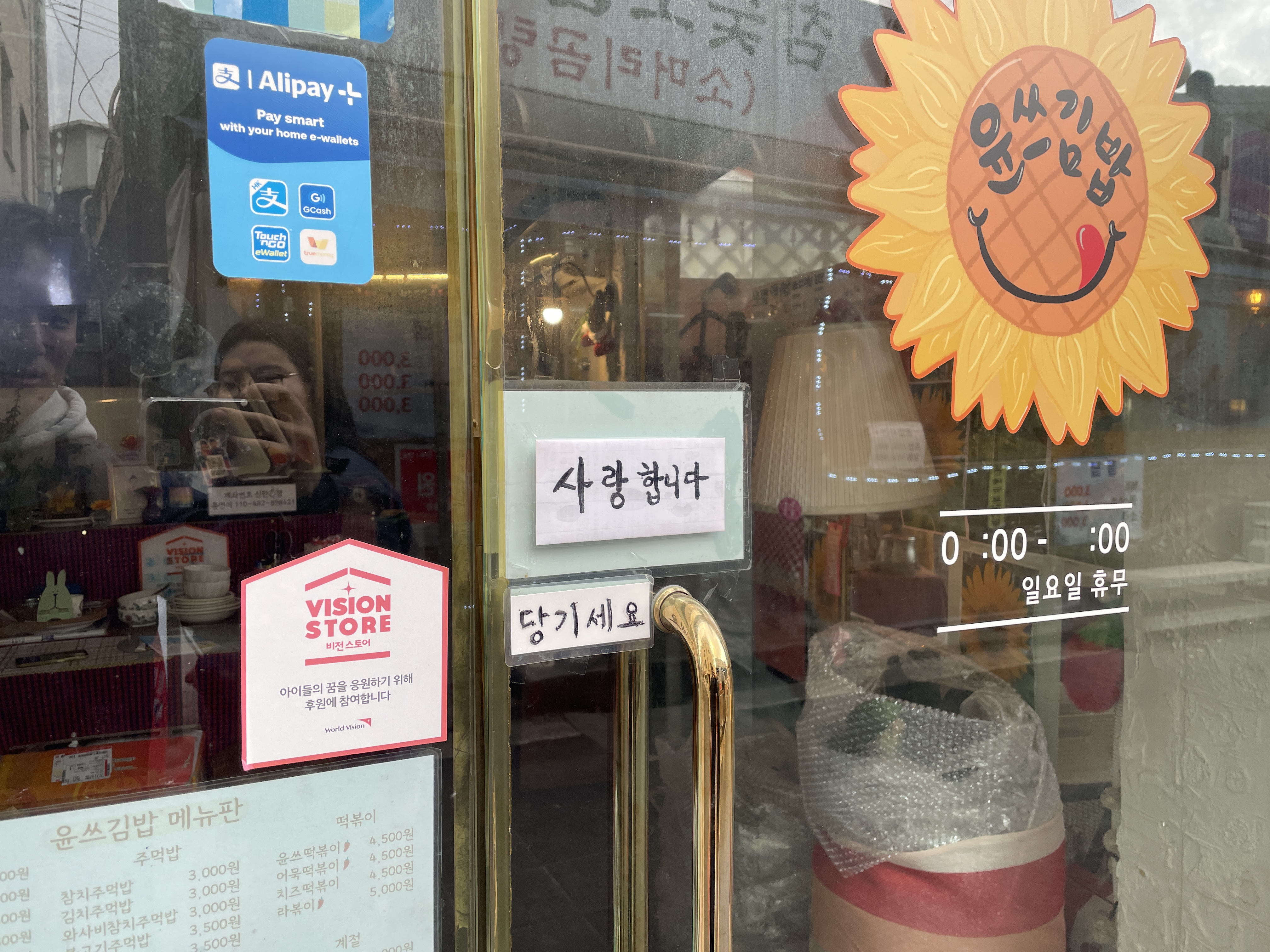 윤쓰김밥 출입문에는 '사랑합니다'라는 인사가 적혀있습니다.