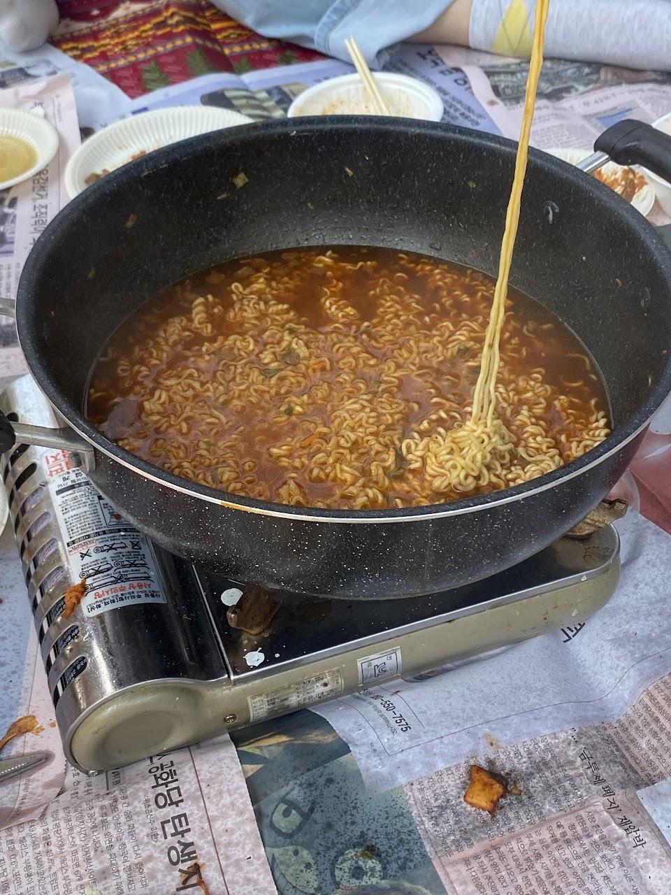 삼겹살, 비빔면, 국물라면까지! 모두 배부르고 만족스러운 식사였습니다.