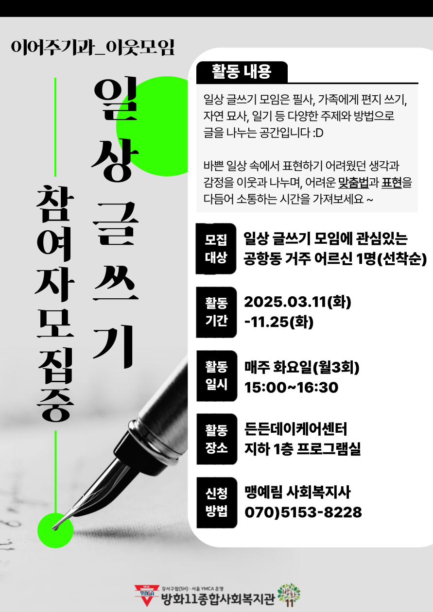 또한, 글쓰기에 관심 있으신 어르신 한 분을 더 모집하고 있으니