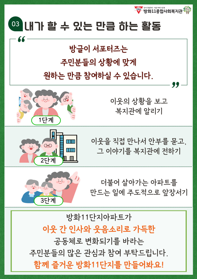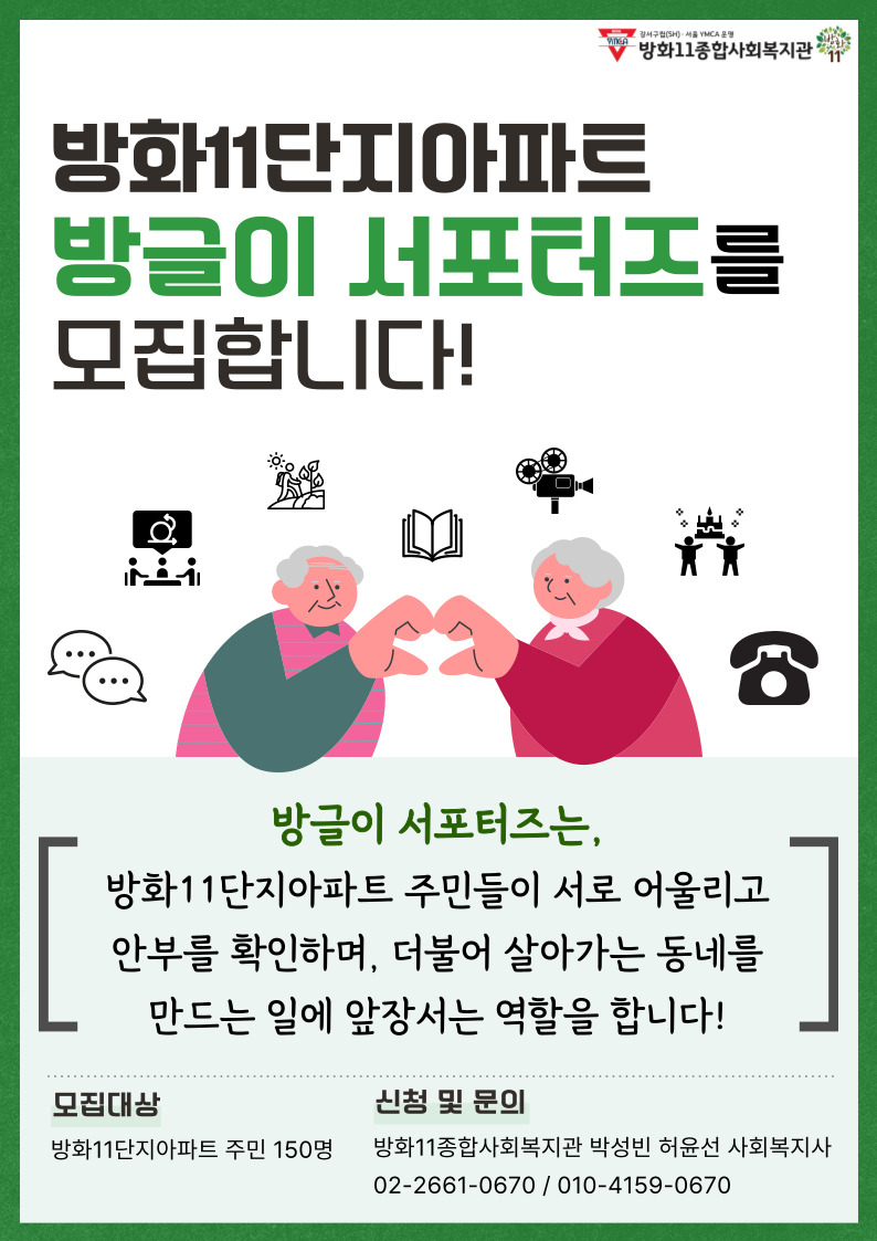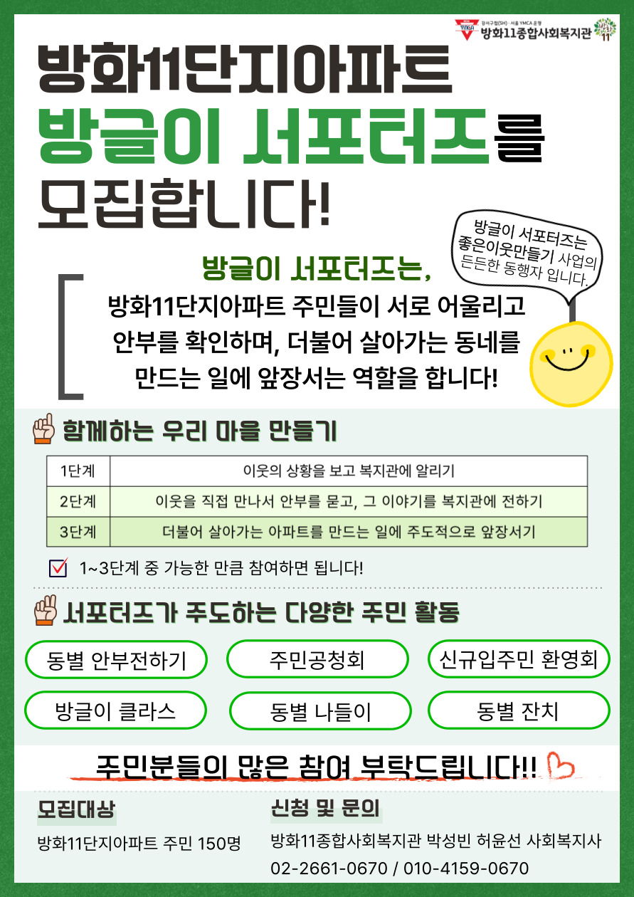 2025년, 방화11단지를 더 따뜻하게 만들기 위해 ‘방글이 서포터즈’를 모집합니다.