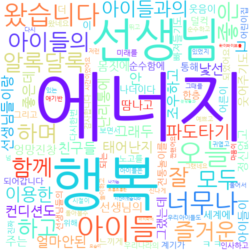 이 외에도 어머님들의 다양한 소감을 모아 핵심키워드로 정리해보니 '에너지', '행복', '선생님'과 같은 단어들이 특히 눈에 띄었습니다.