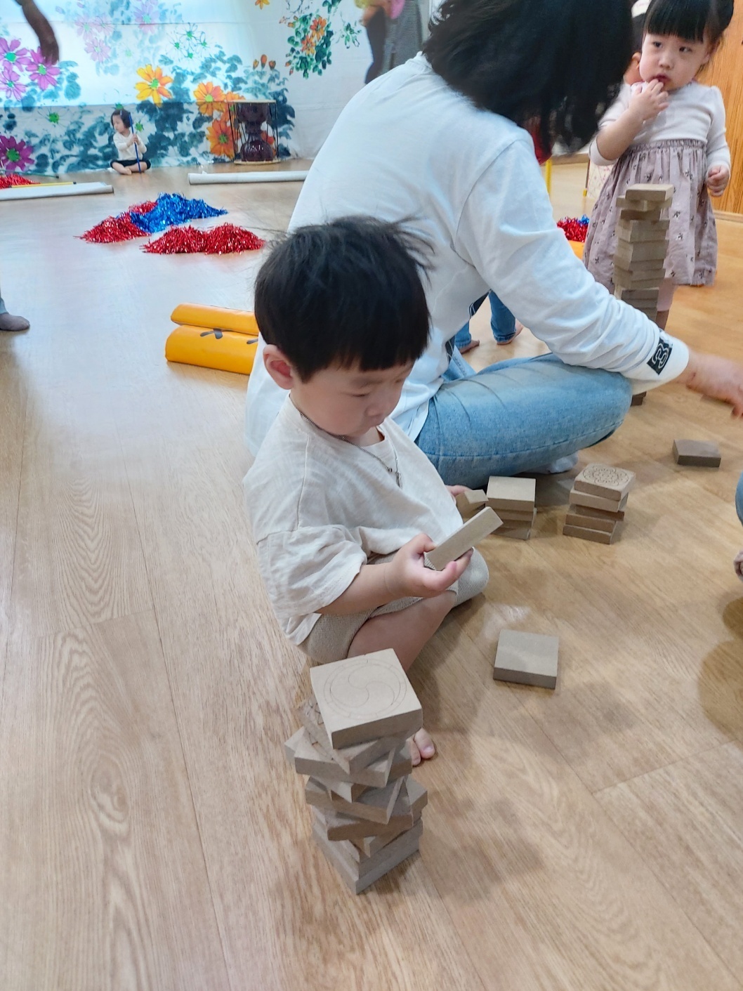 이번 활동은 어린이집 2층 강당에 제기, 비석 등을 놓고 아이들이 돌아다니며 만져보고 쌓아보는 방식으로 진행했습니다.