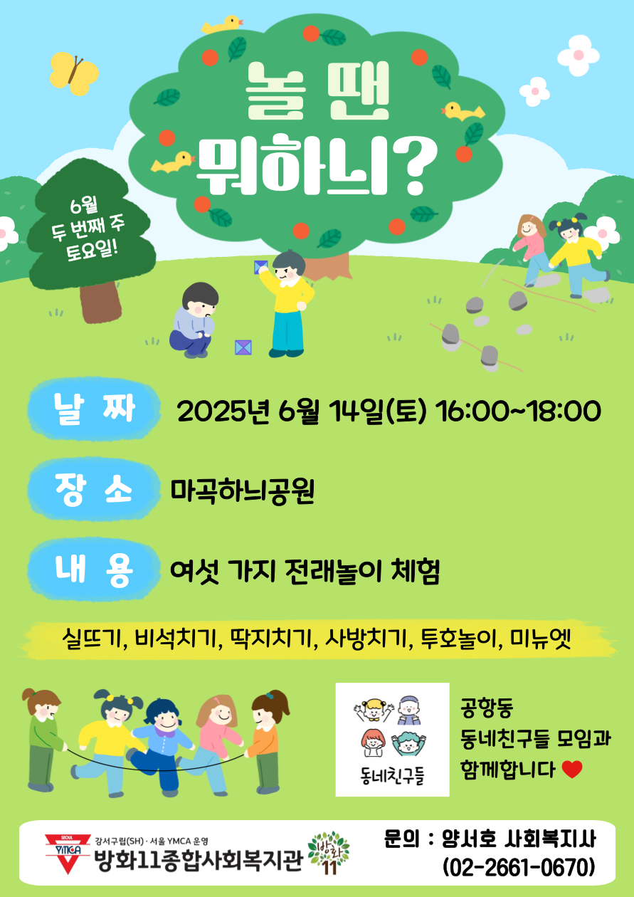 6월 14일(토) 16시~18시에 마곡하늬공원에서 전래놀이 축제 '놀 땐 뭐하늬?'를 진행합니다.